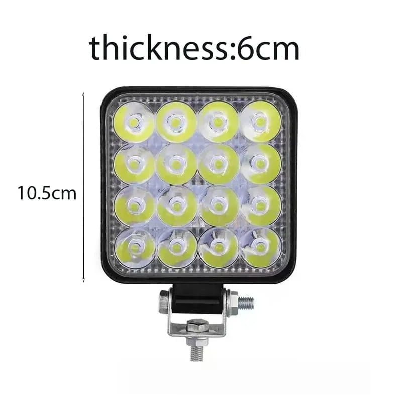 Τετράγωνος προβολέας εργασίας με 16 LED, ισχύος 48W, ιδανικός για αυτοκίνητα, φορτηγά, τρακτέρ, σκάφη και μηχανήματα. Προσφέρει ισχυρό λευκό φως για καθαρή ορατότητα σε συνθήκες χαμηλού φωτισμού. Κατασκευή υψηλής αντοχής με στεγανότητα για προστασία από σκόνη και νερό.