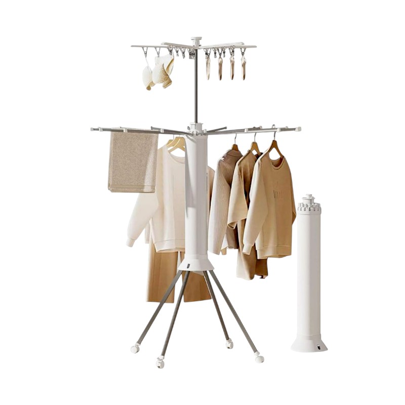 Πτυσσόμενη κρεμάστρα δαπέδου και απλώστρα ρούχων πολλαπλών χρήσεων, με μεταλλικό σκελετό, κλιπς/μανταλάκια μικρών ρούχων και ροδάκια μετακίνησης. Με εργονομικό σχεδιασμό που αναδιπλώνεται για εξαιρετικά εύκολη αποθήκευση και μεταφορά χωρίς να καταλαμβάνει χώρο.