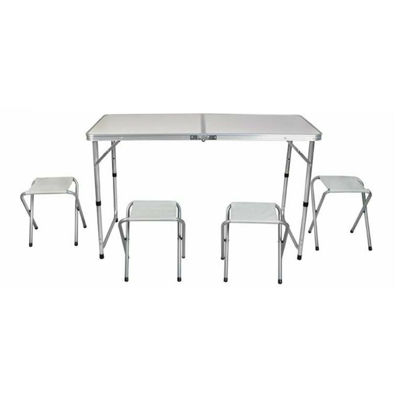 Σετ τραπέζι camping πτυσσόμενο με 4 σκαμπό, με ρυθμιζόμενο ύψος 2 επιπέδων. Πλαστική επιφάνεια πάχους 4mm σε λευκή απόχρωση με γωνίες αλουμινίου και μεταλλικά πόδια.