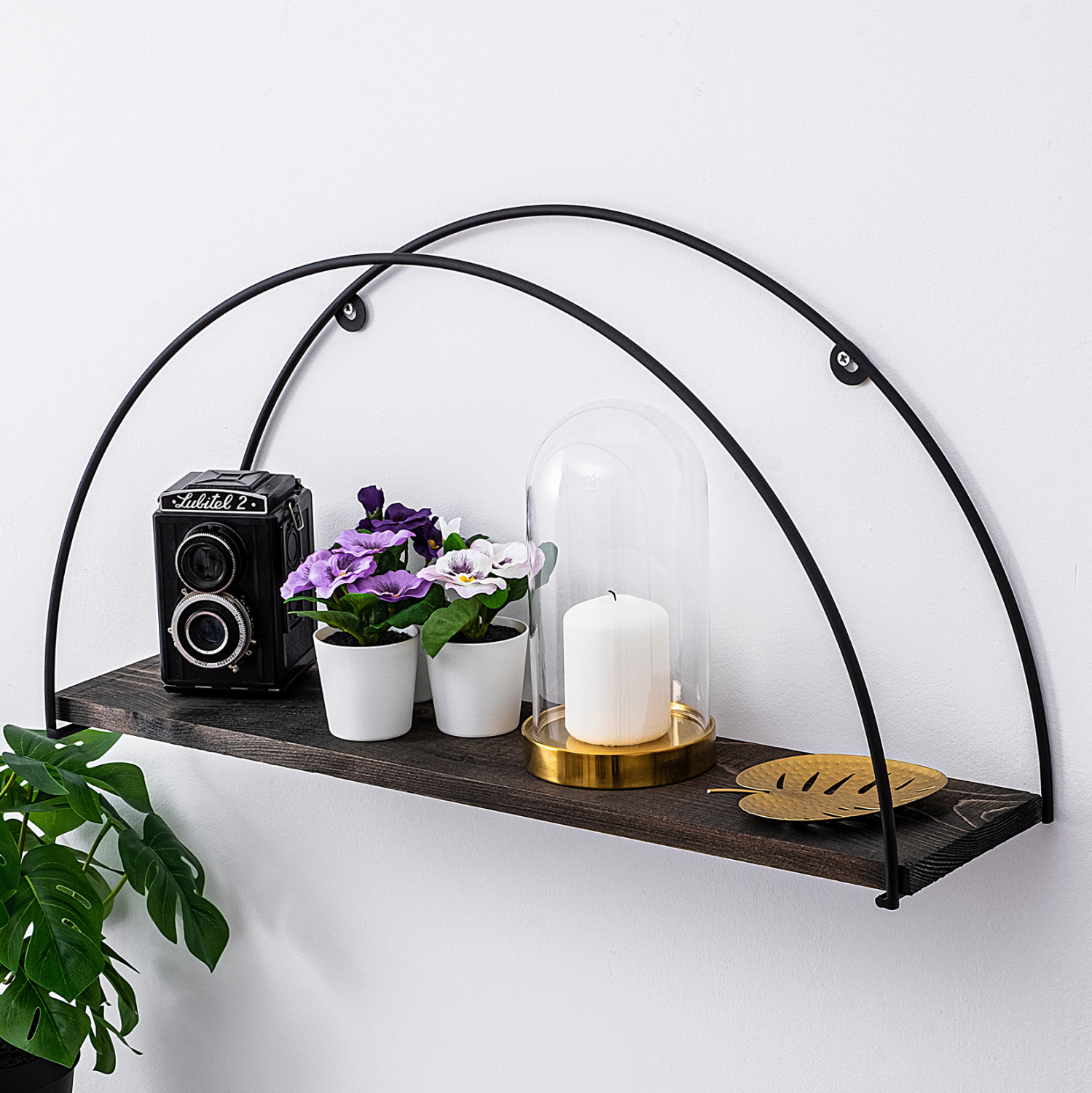 Διακοσμητικό ράφι τοίχου από μεταλλικό σκελετό σε μαύρη απόχρωση και ξύλινη βάση σε καρυδί απόχρωση.