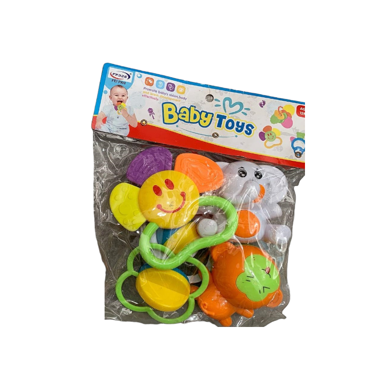 Βρεφικές κουδουνίστρες και μασητικά από ασφαλή μη τοξικά υλικά, σε υπέροχα σχέδια και χρώματα, με χειρολαβές για εύκολη χρήση. Το σετ περιλαμβάνει 4 τεμάχια.