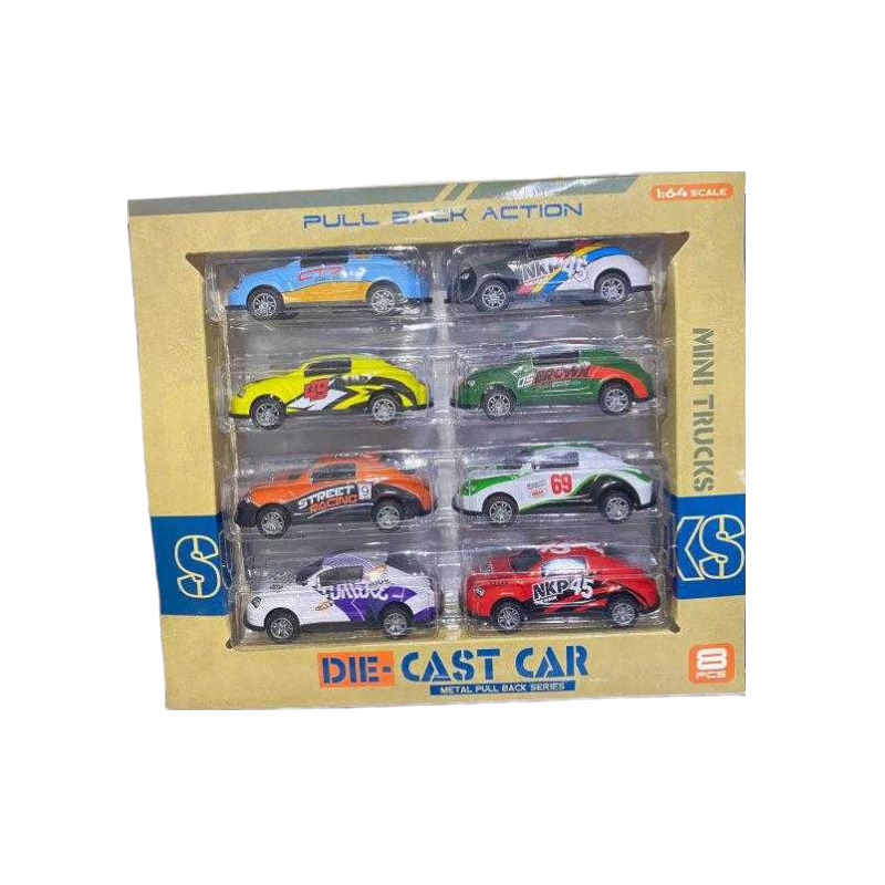 Μεταλλικά αυτοκινητάκια, σετ 8 τεμαχίων, σε διάφορα πολύχρωμα σχέδια και ποικιλία σχεδιασμού, με Pull Back. Ολοκλήρωσε τη συλλογή και ετοιμάσου για συναρπαστικούς αγώνες ταχύτητας!
