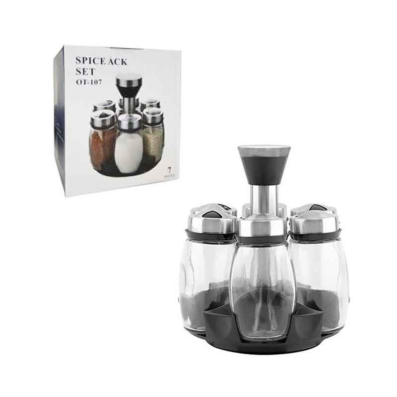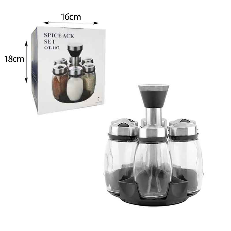 Οργανώστε τα αγαπημένα σας μπαχαρικά με στυλ και πρακτικότητα με αυτό το σετ 7 τεμαχίων OT-107. Περιλαμβάνει 6 γυάλινα δοχεία με ανοξείδωτα καπάκια και μία κομψή, περιστρεφόμενη βάση για εύκολη πρόσβαση. Ιδανικό για την κουζίνα σας, προσφέρει καθαρή αποθήκευση και εξοικονόμηση χώρου.