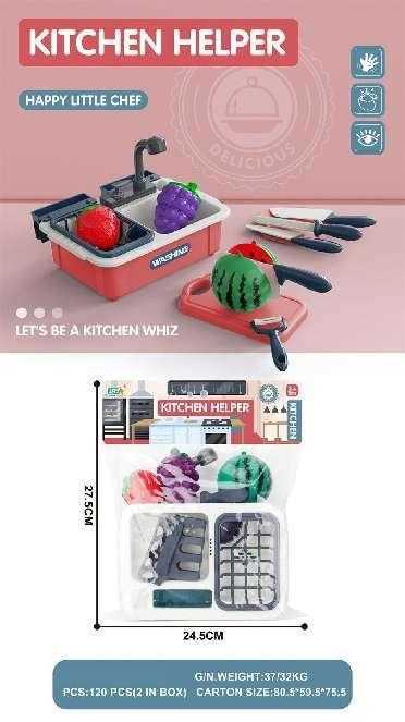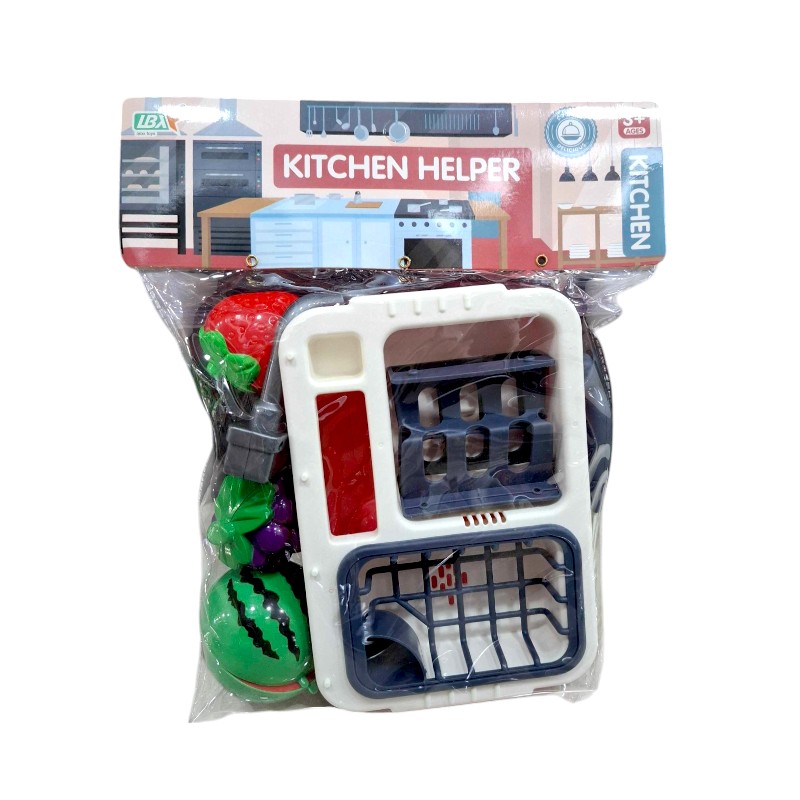 Παιχνίδι νεροχύτης κουζίνας με αξεσουάρ σκεύη και τρόφιμα, σε υπέροχο πολύχρωμο σχεδιασμό.