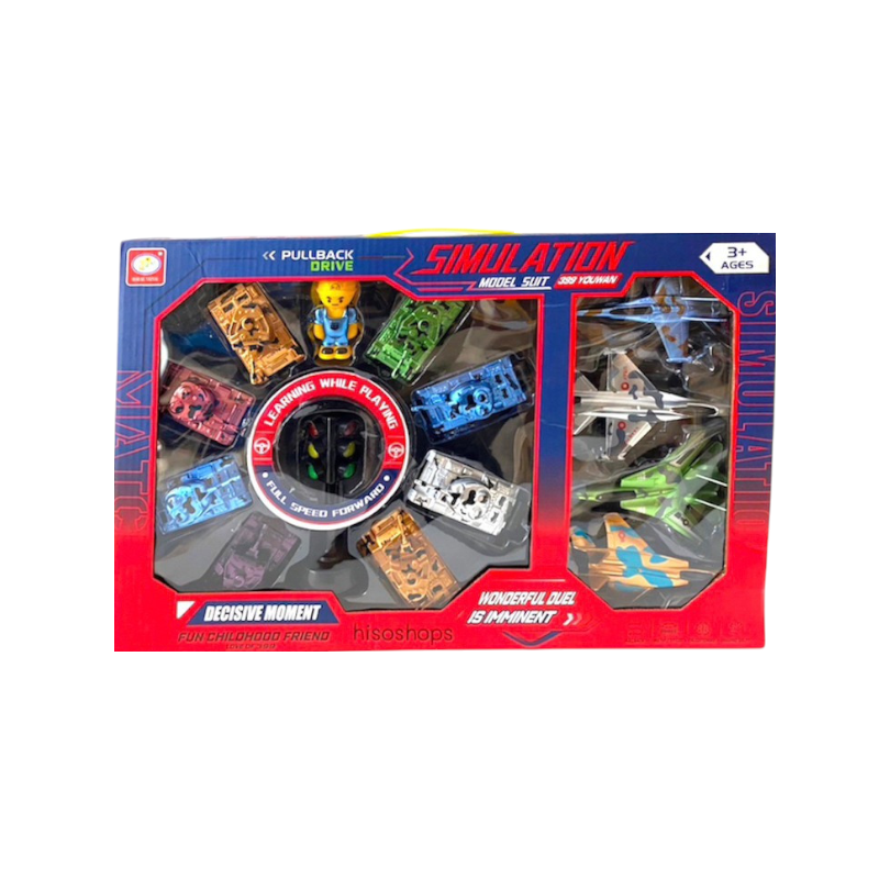 Πολεμικά οχήματα, τανκς και αεροπλάνα, σε διάφορα πολύχρωμα σχέδια και ποικιλία σχεδιασμού, με Pull Back. Ολοκλήρωσε τη συλλογή και ετοιμάσου για συναρπαστικούς αγώνες ταχύτητας!