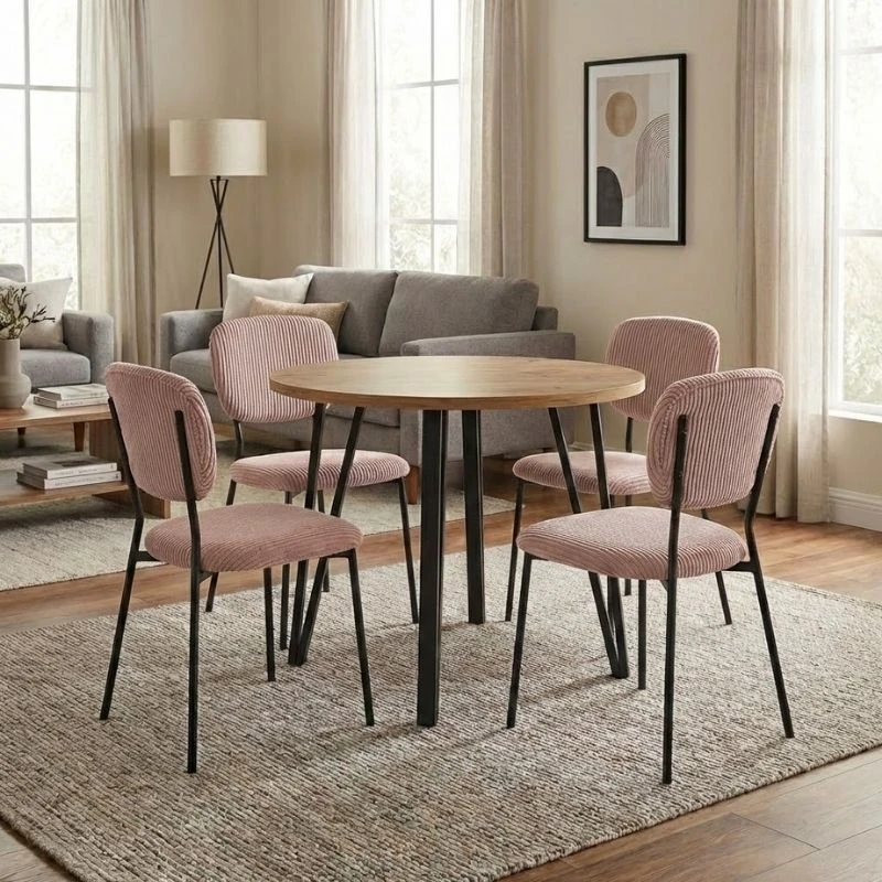 Η τραπεζαρία Xana – Kevin θα φέρει μία αίσθηση εκλεπτυσμένης κομψότητας στον χώρο σας. Το πλούσιο κοτλέ ύφασμα της καρέκλας χαρίζει ζεστασιά και υφή, ενώ τα μεταλλικά πόδια προσδίδουν μοντέρνο χαρακτήρα και σταθερότητα. Ιδανική επιλογή τόσο για το σπίτι όσο και για επαγγελματικούς χώρους που θέλουν να επικοινωνήσουν ποιότητα και design σε κάθε λεπτομέρεια.