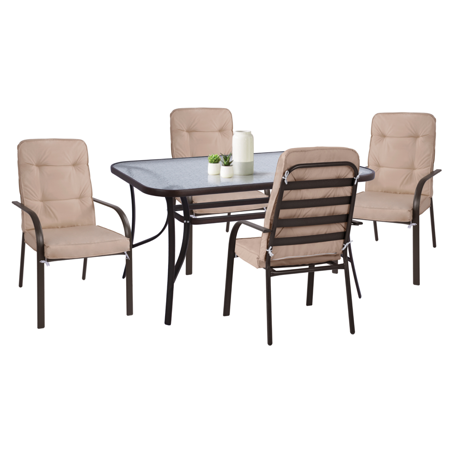 FB911880—Σετ εξωτερικού χώρου με τραπέζι με ΚΑΦΕ μεταλλικό σκελετό και γυάλινη θολή ΕΝΙΣΧΥΜΕΝΗ επιφάνεια και 4 μεταλλικές πολυθρόνες με ΚΑΦΕ σκελετό και αναπαυτικό μαξιλάρι σε ΜΠΕΖ χρώμα. Επίσης, είναι ΣΤΟΙΒΑΖΟΜΕΝΕΣ άρα και ιδιαιτέρως πρακτικές, αφού αποθηκεύονται εύκολα και στον μικρότερο δυνατό χώρο.