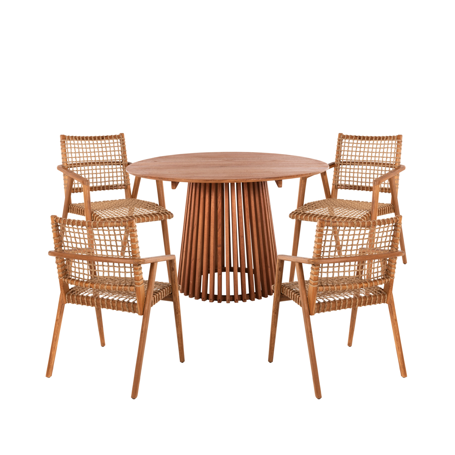 Αυτό το σετ τραπεζαρίας εσωτερικού χώρου 5τμχ αποτελείται από ένα στρογγυλό τραπέζι κατασκευασμένο εξολοκλήρου από ξύλο MINDI σε ΦΥΣΙΚΟ χρώμα, και από 4 καρέκλες τραπεζαρίας κατασκευασμένες από ξύλο teak και P.E. σχοινί σε ΦΥΣΙΚΟ χρώμα.