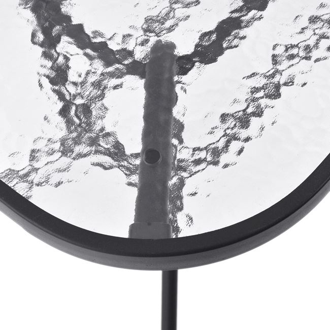 Ένα τραπέζι μεταλλικό εξωτερικού χώρου σε χρώμα γκρι-ανθρακί, με ενσωματωμένο τζάμι ασφαλείας (secure)