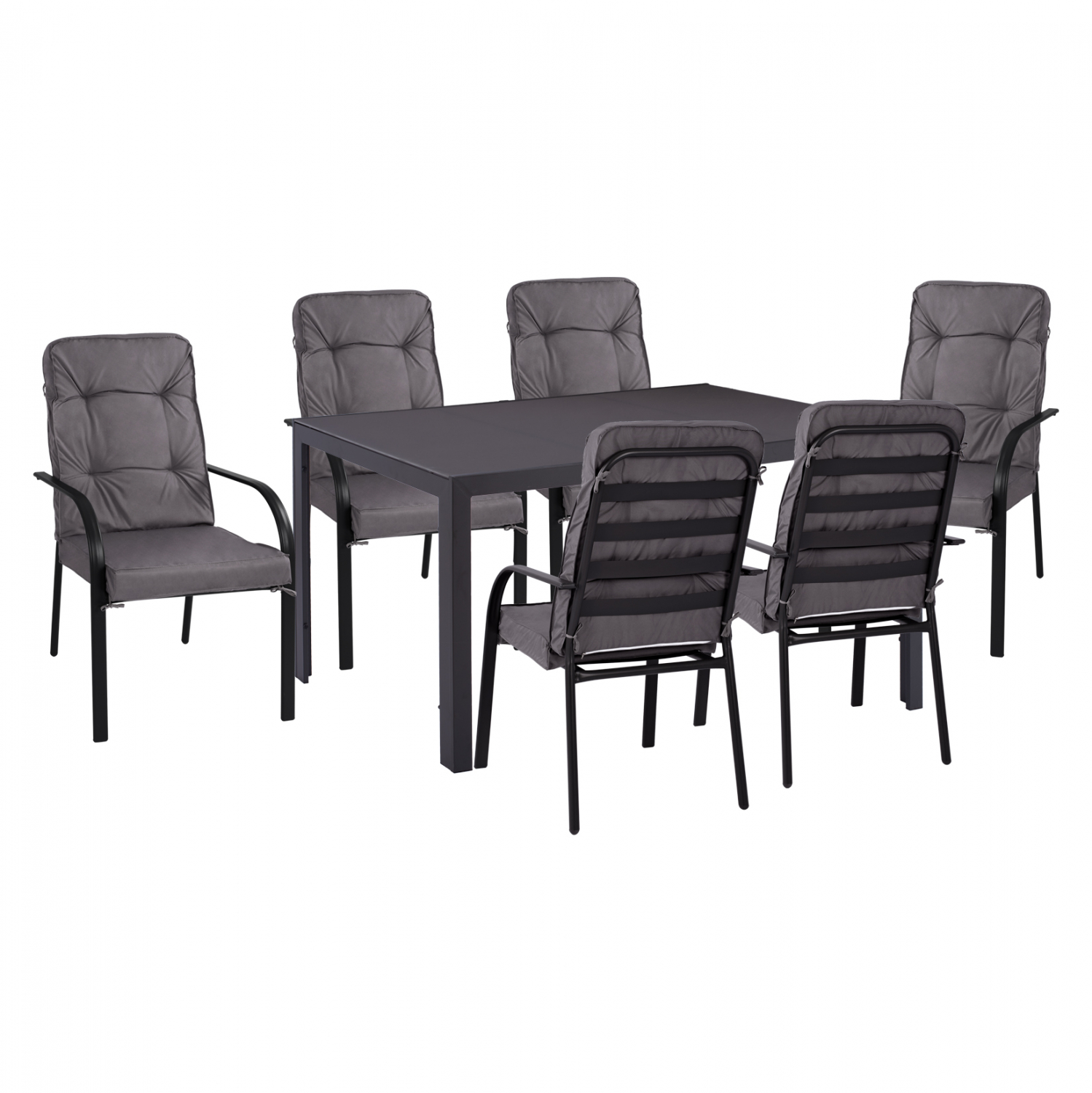 Έξι μοντέρνες πολυθρόνες εξωτερικού χώρου κατασκευασμένες από μέταλλο σε γκρι απόχρωση, με μεταλλικούς ιμάντες στήριξης για το μαξιλάρι.