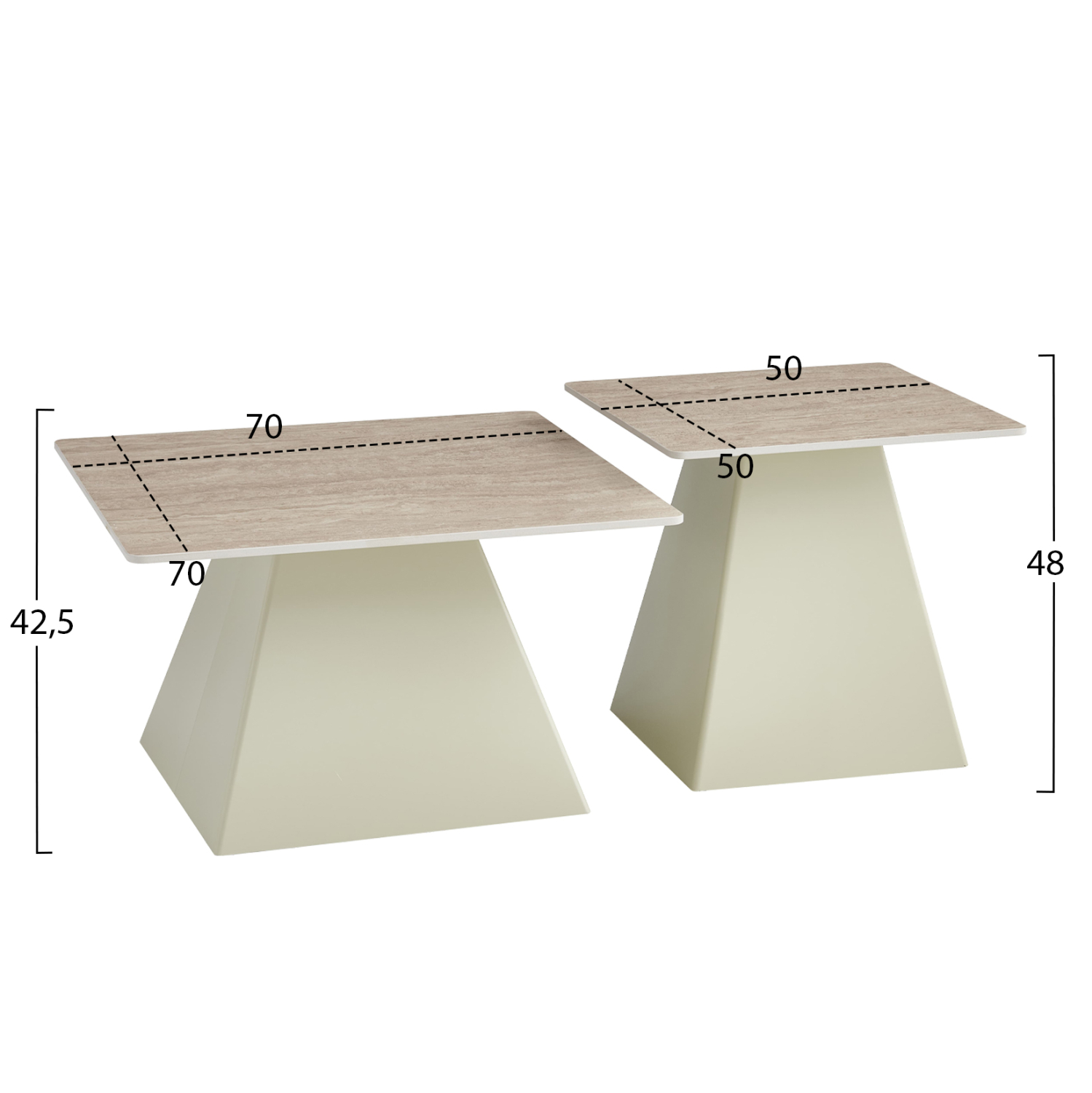 Αυτό το σετ τραπεζιών για το σαλόνι αποτελείται από 2 μεταλλικά τετράγωνα τραπεζάκια διαφορετικών μεγεθών. Οι βάσεις τους έχουν σχήμα πυραμίδας σε ΣΑΜΠΑΝΙ χρώμα, ενώ οι επιφάνειες είναι κεραμικές σε χρωματισμό TRAVERTINE STONE. Ιδανικά τόσο για το σπίτι, όσο και για επαγγελματικούς χώρους.
