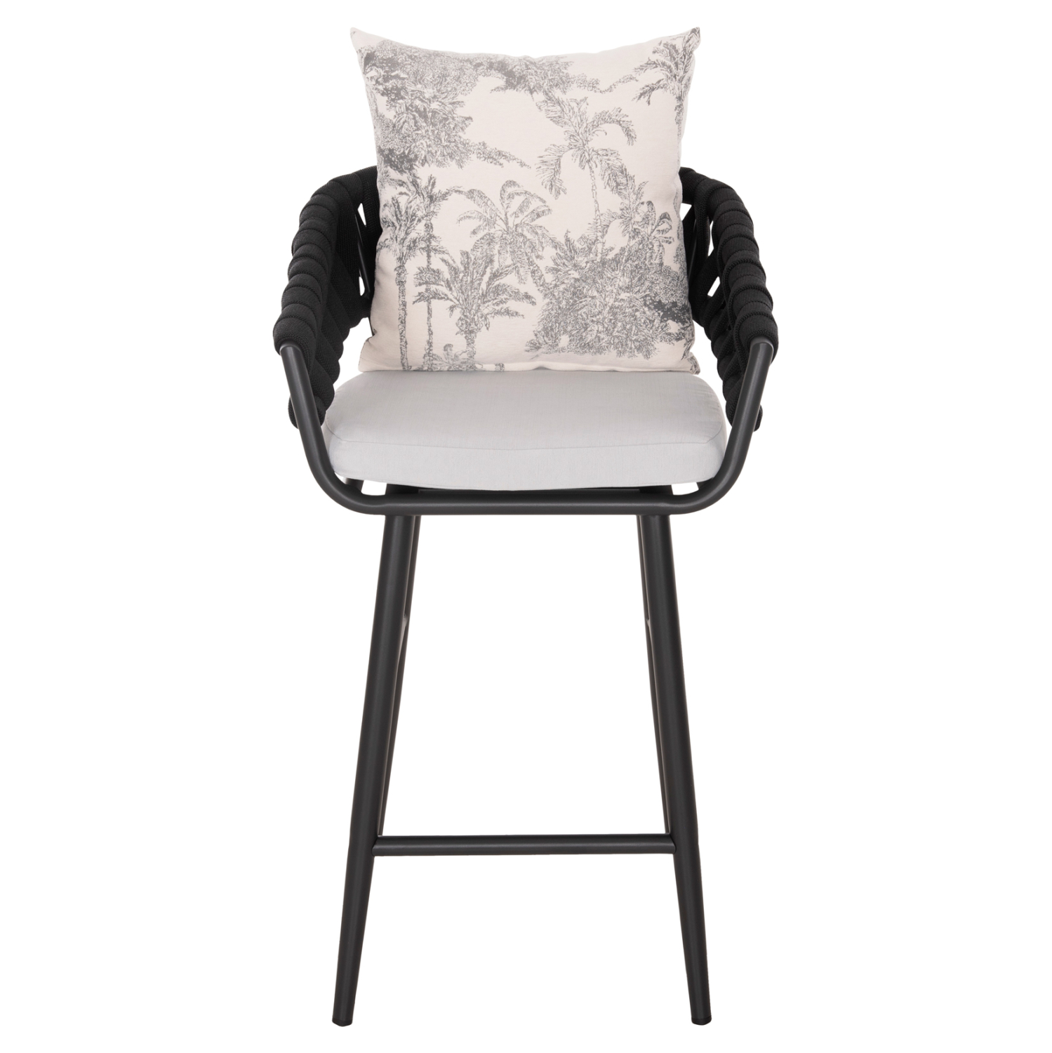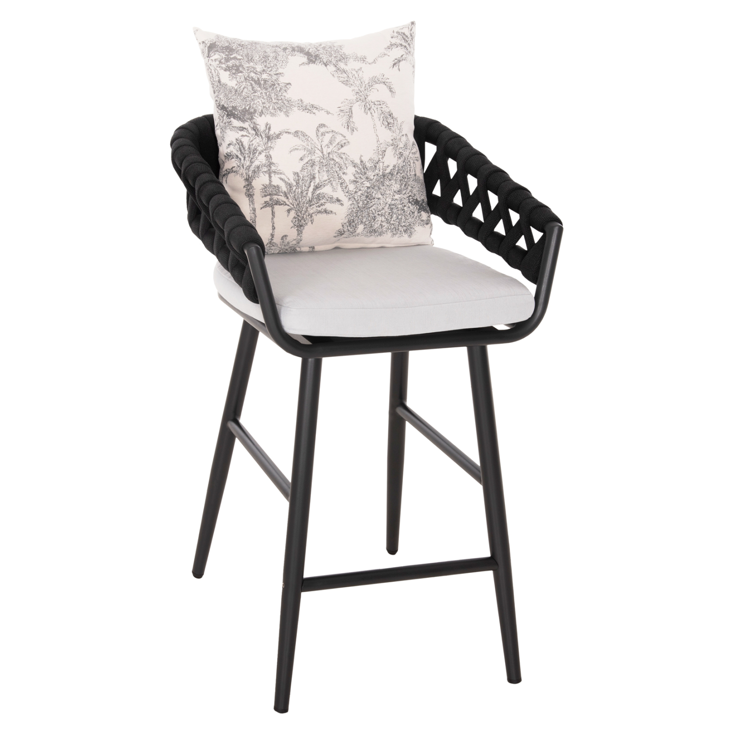 Το σκαμπό μπαρ αλουμινίου FB96142.01 σε ΑΝΘΡΑΚΙ χρώμα δεν έχει ξεχωριστά μπράτσα αλλά η πλάτη είναι ημικυκλική αγκαλιάζοντας το σώμα. Πρόκειται για ένα ξεχωριστό σκαμπό με χαμηλή πλάτη από συνθετικό φαρδύ πολυεστερικό σχοινί (terylene). Το ιδιαίτερο χαρακτηριστικό αυτού του σκαμπό είναι ότι διαθέτει αναπαυτικά μαξιλάρια (με φερμουάρ) τόσο στο κάθισμα σε ΛΕΥΚΟ χρώμα, όσο και στην πλάτη σε ΕΚΡΟΥ χρώμα με PRINT σχέδιο.