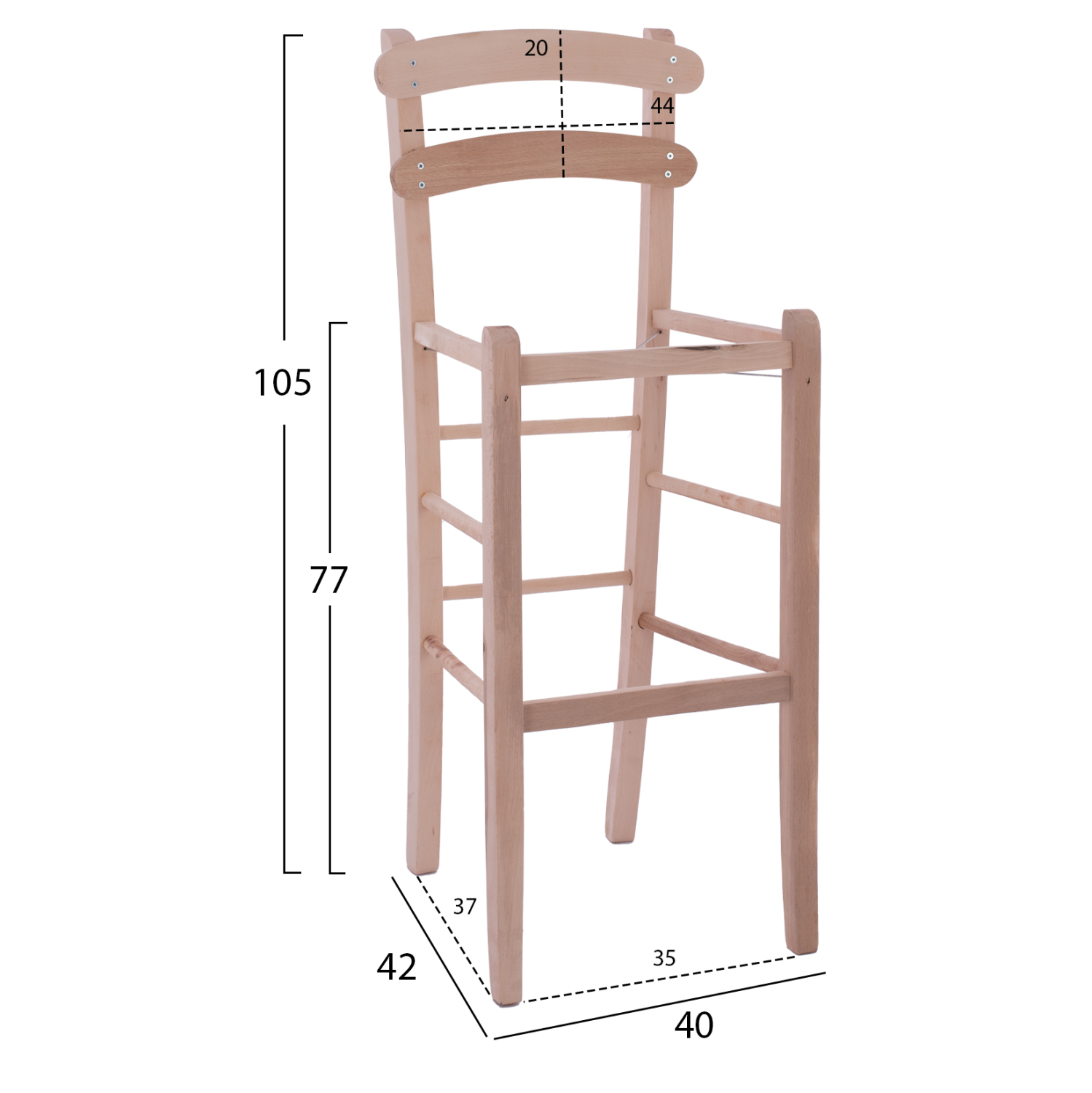 Αυτό το ξύλινο σκαμπό είναι κατασκευασμένο με παραδοσιακό σχεδιασμό με 4 ψηλά πόδια, που ενώνονται με βέργες που χρησιμεύουν και ως υποπόδια, τετράγωνο κάθισμα και ικανοποιητική πλάτη, χωρίς μπράτσα. Παραδίδεται άβαφο και μπορεί να χρησιμοποιηθεί σε διάφορους επαγγελματικούς χώρους, αρκεί να υπάρξει αντίστοιχη διακοσμητική «ματιά».