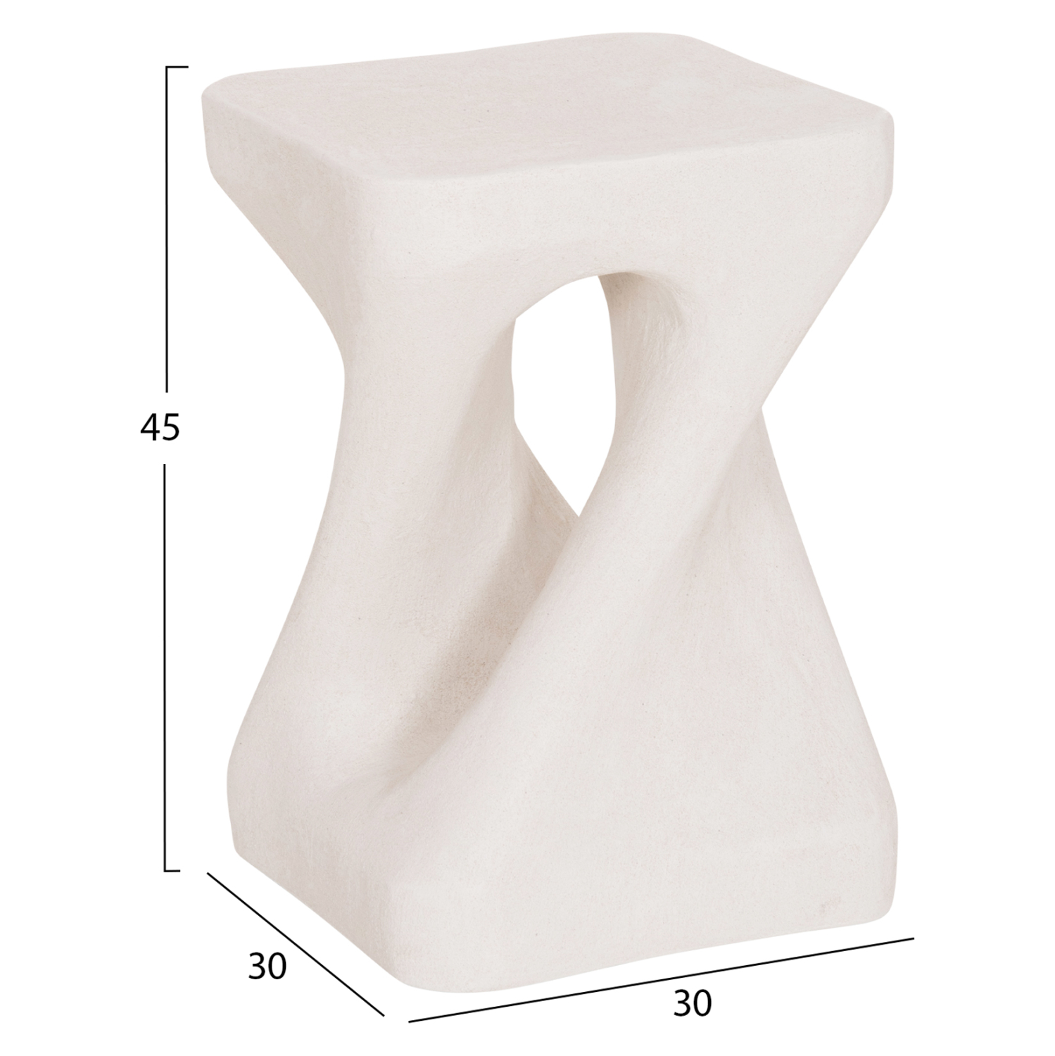 Το σκαμπό είναι κατασκευασμένο από polyresin (πολυρητίνη), ένα σύγχρονο συνθετικό υλικό υψηλής αντοχής που χρησιμοποιείται ευρέως σε premium διακοσμητικά αντικείμενα και έπιπλα design. Η πολυρητίνη προσφέρει σταθερότητα, ανθεκτικότητα στη χρήση και δυνατότητα δημιουργίας σύνθετων σχημάτων με ιδιαίτερη αισθητική. Η σαγρέ υφή στην επιφάνεια ενισχύει την αίσθηση φυσικού υλικού και χαρίζει στο αντικείμενο μια σύγχρονη, γλυπτική παρουσία.