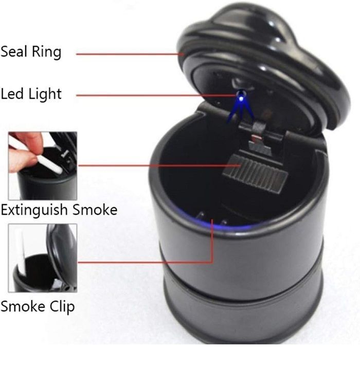 Σταχτοδοχείο αυτοκινήτου με εσωτερικό φωτισμό LED που ενεργοποιείται με το άνοιγμα και ειδικό κλιπ στήριξης τσιγάρου.