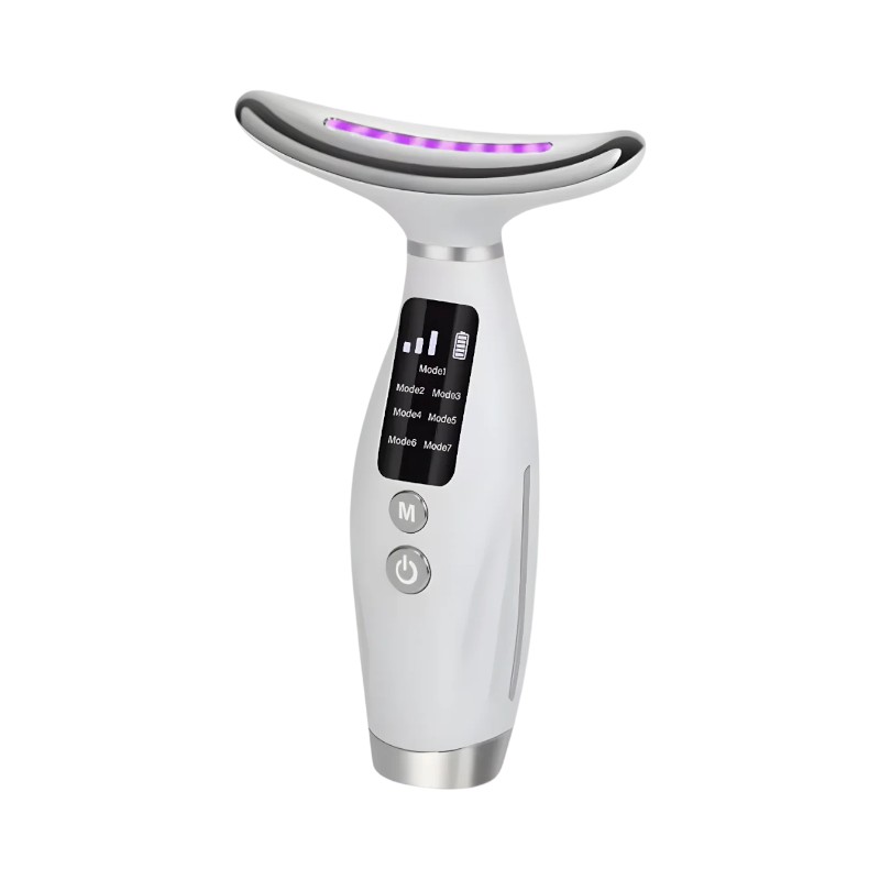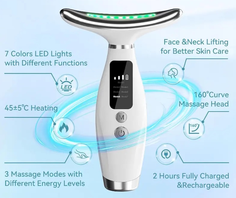 Συσκευή φωτοθεραπείας προσώπου και λαιμού, κατάλληλη για θεραπευτική και αισθητική εφαρμογή. Δόνηση & Θερμότητα: Οι δονήσεις υψηλής συχνότητας (πάνω από 10.000 ανά λεπτό) και η ήπια θέρμανση (περ. 45°C) βοηθούν στο άνοιγμα των πόρων, προάγουν την κυκλοφορία του αίματος, βελτιώνουν το μεταβολισμό των κυττάρων και ενισχύουν την απορρόφηση των προϊόντων περιποίησης του δέρματος (οροί, λοσιόν). Αυξάνει την ροή του αίματος στην περιοχή χρήσης της, διεγείροντας την κυτταρική ανανέωση, ενισχύει την παραγωγή κολλαγόνου, βοηθάει στην επούλωση ουλών, στη σύσφιξη του δέρματος και στην καταπολέμηση των ρυτίδων, ενώ συμβάλλει στην μείωση της ακμής.