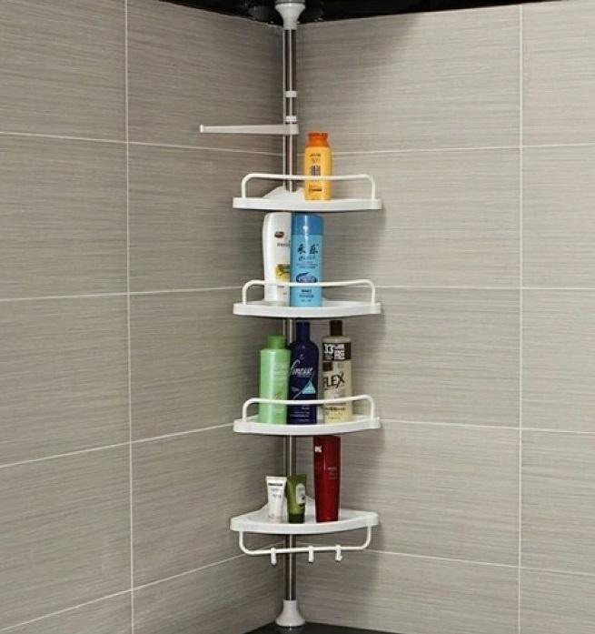 Πλαστική τηλεσκοπική ραφιέρα μπάνιου με εύκολη τοποθέτηση χωρίς βίδες και ρυθμιζόμενο ύψος από 1 έως 3.2m. Με 4 τριγωνικά ράφια διαστάσεων και δυνατότητα ρύθμισης θέσεως. Tηλεσκοπικό κοντάρι με βεντούζα. Ρυθμιζόμενη απόσταση ραφιών.
