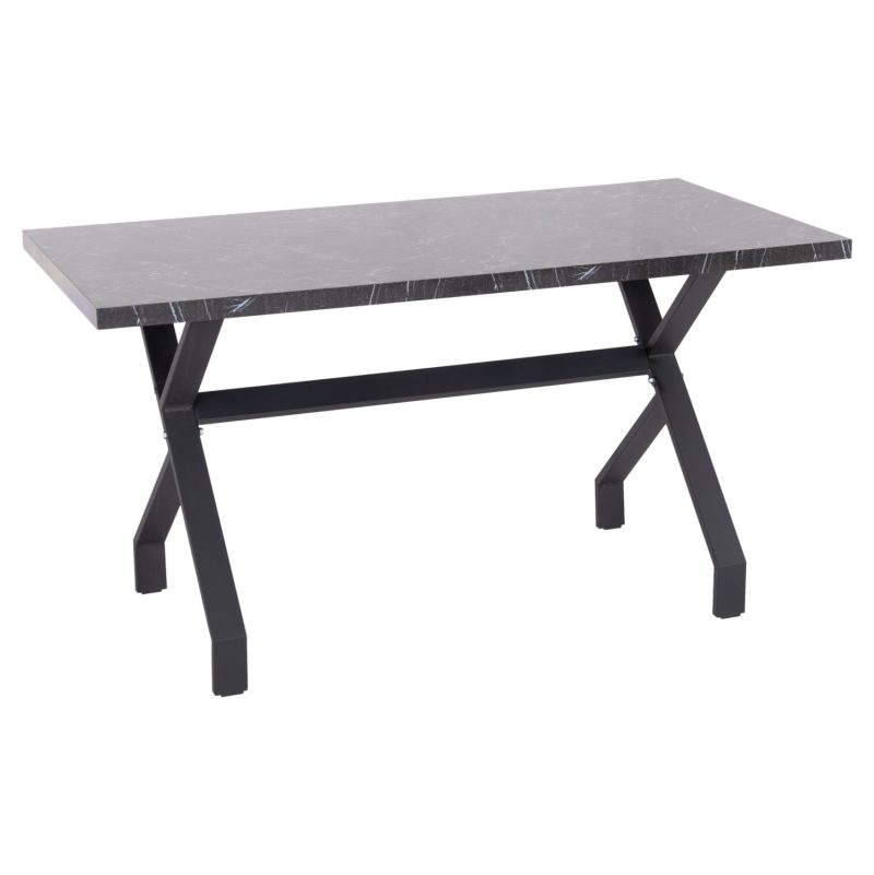 Το FB918221.02 είναι ένα ορθογώνιο τραπέζι με επιφάνεια από μελαμίνη σε χρώμα ΜΑΥΡΟ ΜΑΡΜΑΡΟ. Ξεχωρίζει για την όμορφη διάταξη που έχουν τα ΜΑΥΡΑ μεταλλικά πόδια. Πρόκειται για ένα απλό τραπέζι σε κανονική διάσταση, που μπορεί να εξυπηρετήσει άνετα 4 τουλάχιστον άτομα.