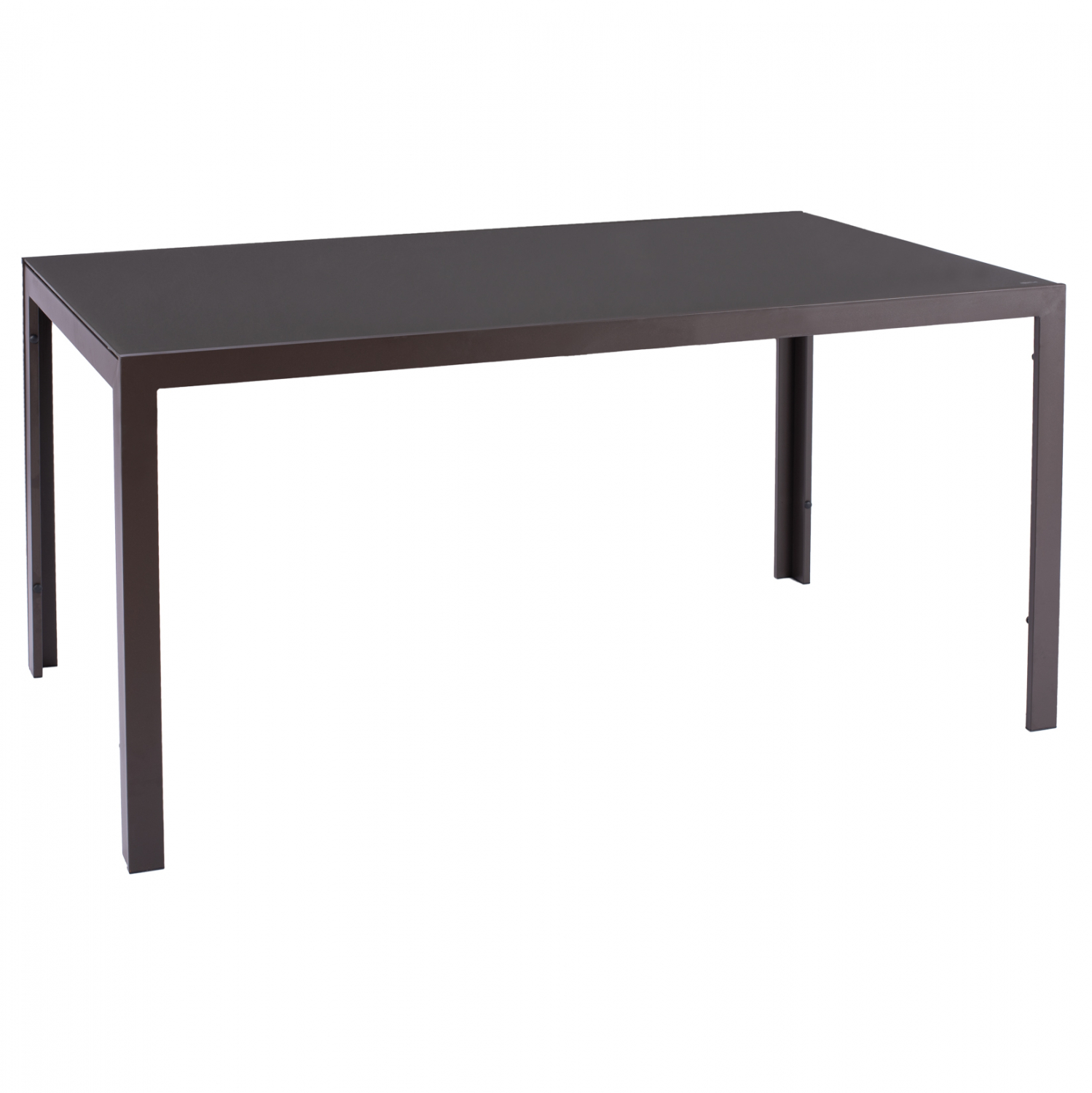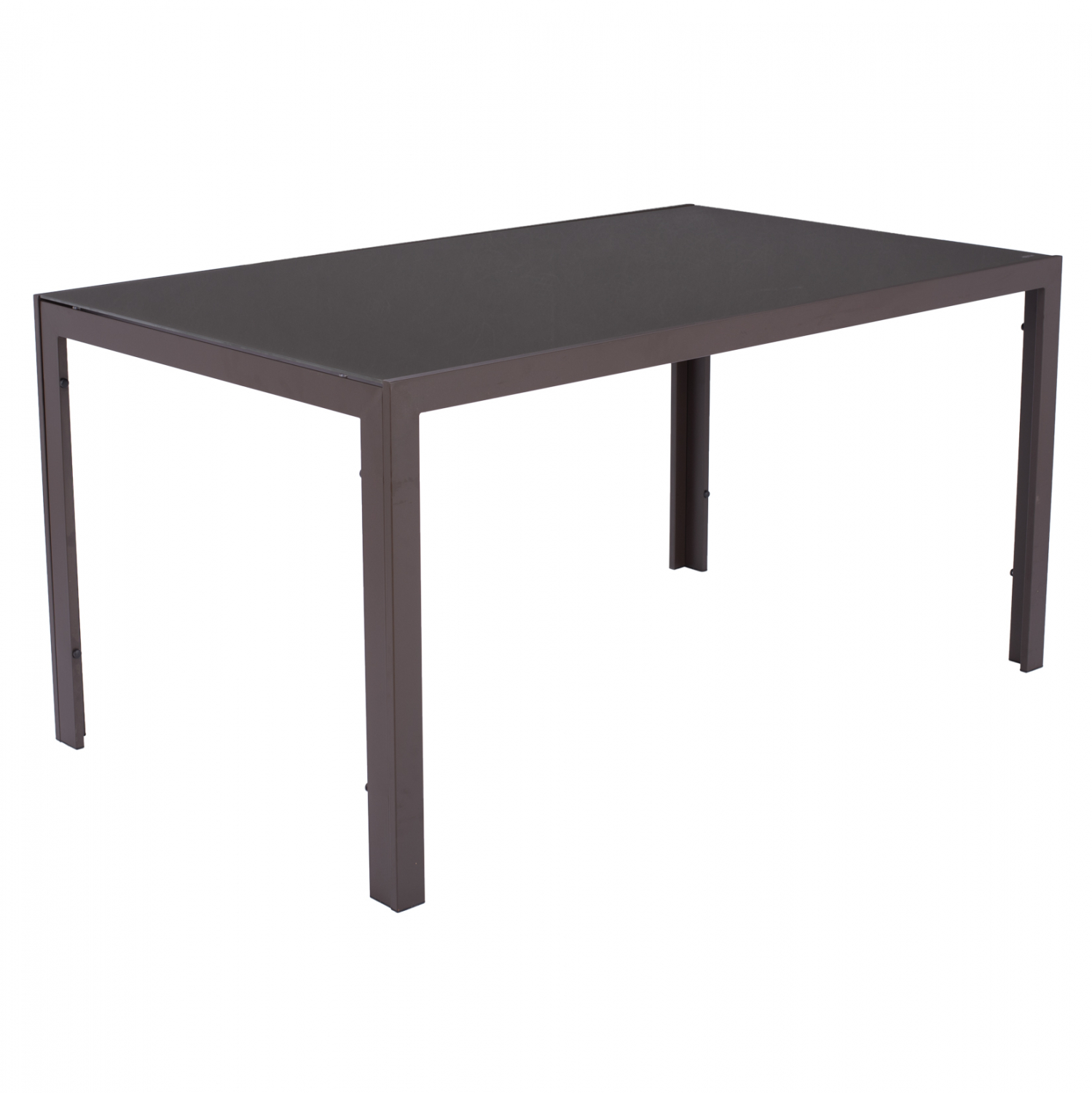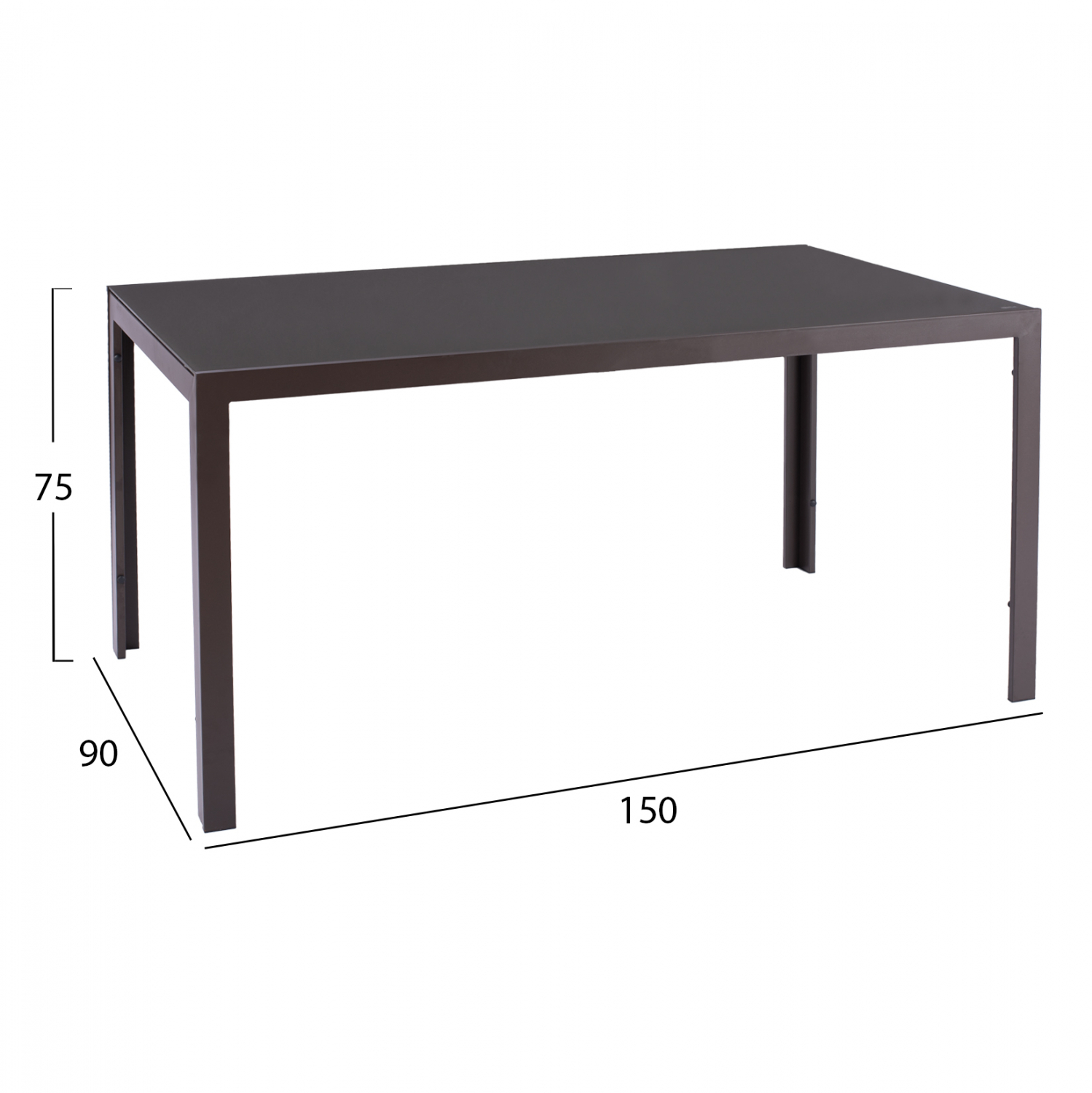 Τραπέζι εξωτερικού χώρου μεταλλικό σε απόχρωση καφέ με γυαλί στην επιφάνειά του.