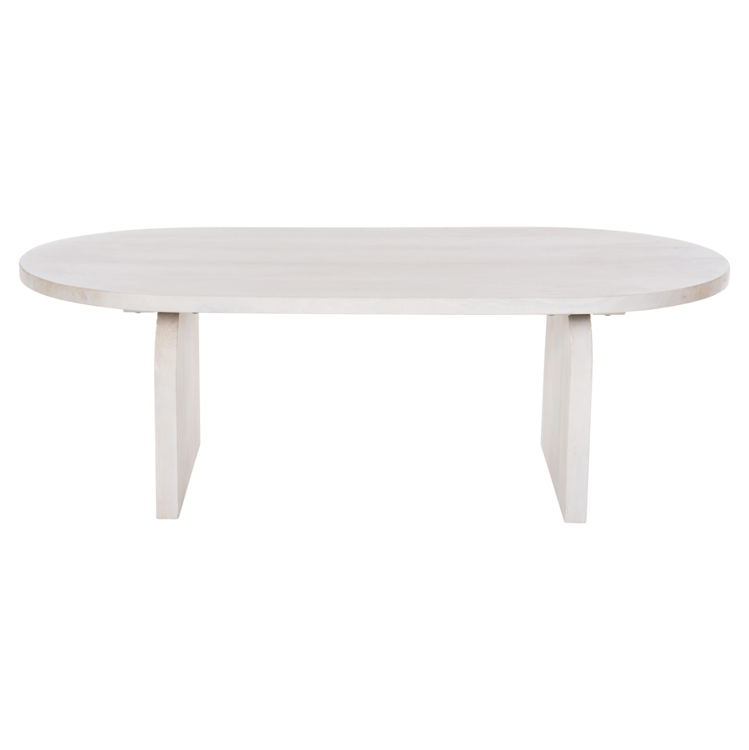 Ανακαλύψτε το τραπέζι σαλονιού FB99691 που είναι εξολοκλήρου κατασκευασμένο από μασίφ ξύλο mango σε ΛΕΥΚΟ χρώμα. To σχήμα είναι τυπικό οβάλ και στηρίζεται σε 2 μασίφ αψίδες από το ίδιο ξύλο και του ίδιου χρώματος.