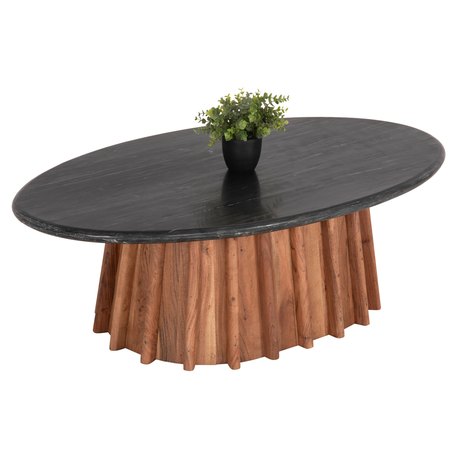 Το FB99934 είναι ένα πανέμορφο οβάλ τραπέζι σαλονιού σε ικανοποιητική διάσταση με επιφάνεια από ΜΑΥΡΟ ΜΑΡΜΑΡΟ. Αυτή η βαριά επιφάνεια στηρίζεται σε μια κεντρική κολώνα με κωνικό οβάλ σχήμα από ποιοτικό μασίφ ξύλο ακακίας σε ΦΥΣΙΚΟ χρώμα, αριστοτεχνικά λαξευμένο.