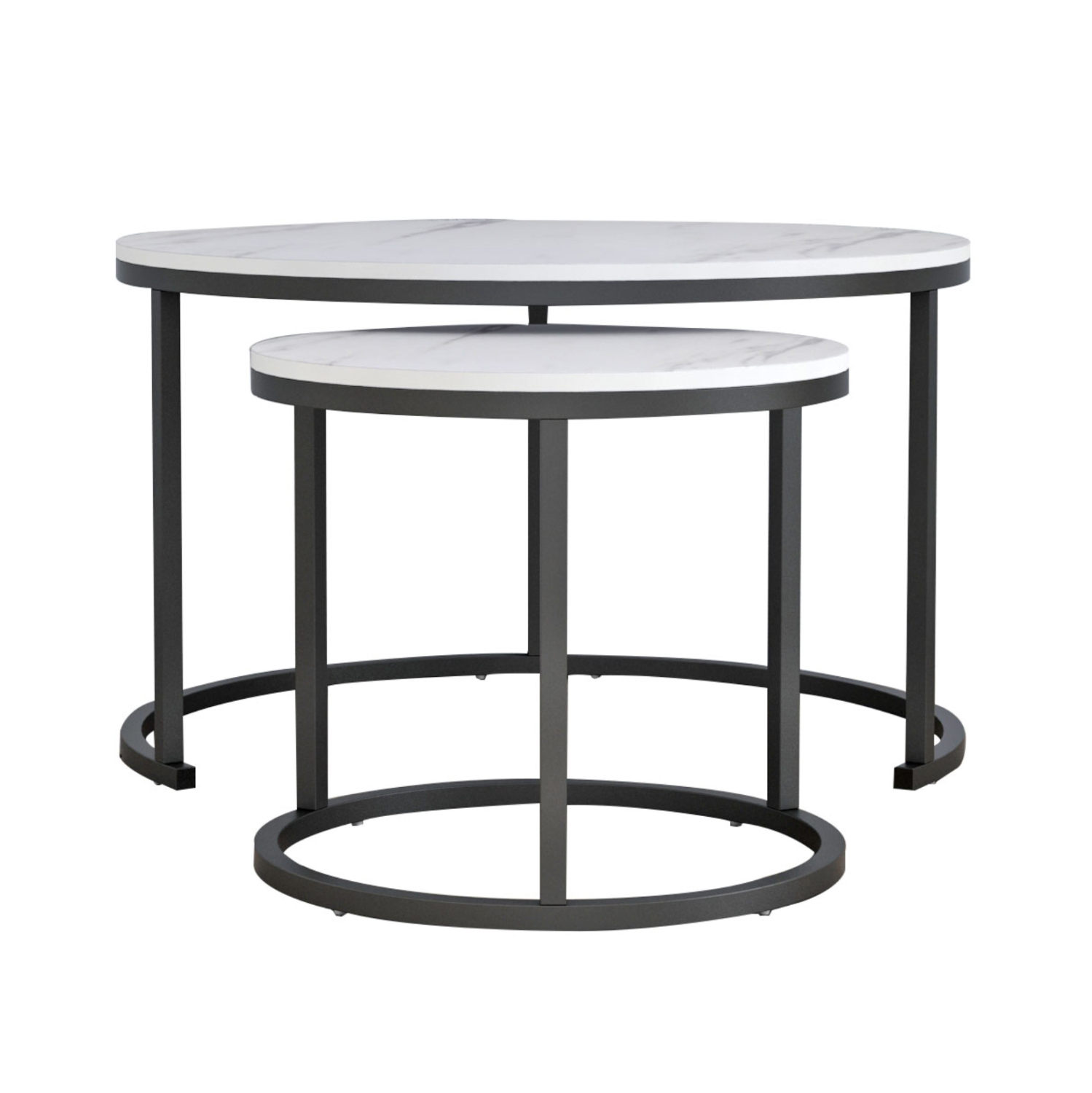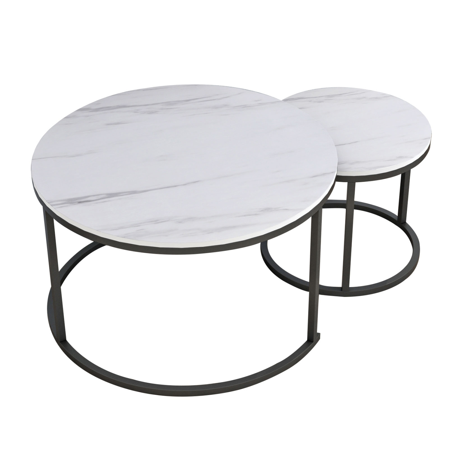 FB98763.12 τραπεζάκια σαλονιού—– Τα τραπεζάκια FB98763.12 θα σας ενθουσιάσουν με το στυλ και την πρακτικότητά τους. Πρόκειται για 2 τραπεζάκια ένα ψηλότερο κι ένα πιο κοντό με ιδιαίτερο χαρακτηριστικό ότι το ψηλότερο στηρίζεται σε μια ημικυκλική βάση με τρία μεταλλικά πόδια, πράγμα που επιτρέπει στο πιο κοντό να χωράει και να αποθηκεύεται ακριβώς από κάτω. Οι βάσεις και των δύο τραπεζιών είναι μεταλλικές σε μαύρο χρώμα, ενώ οι επιφάνειές τους είναι σε απομίμηση λευκού μαρμάρου από MDF.