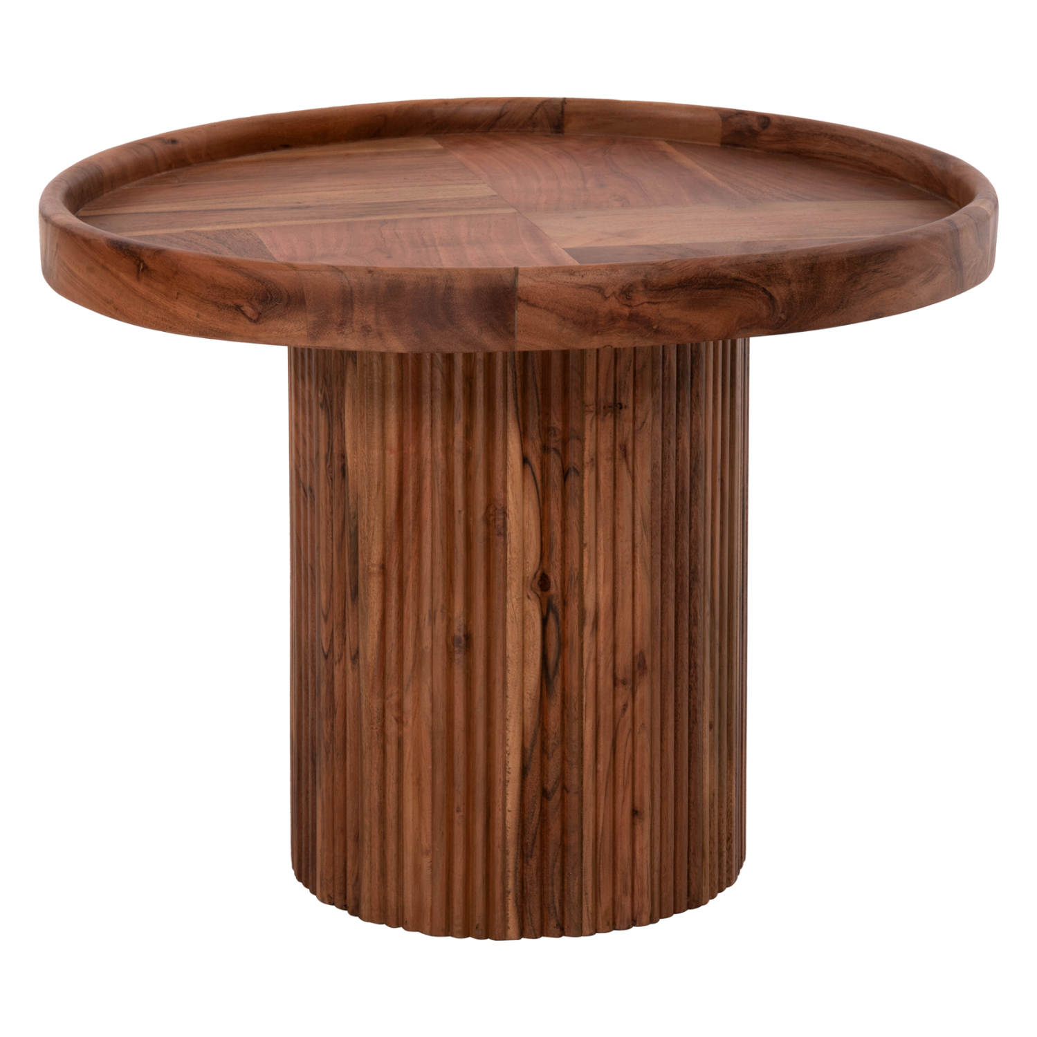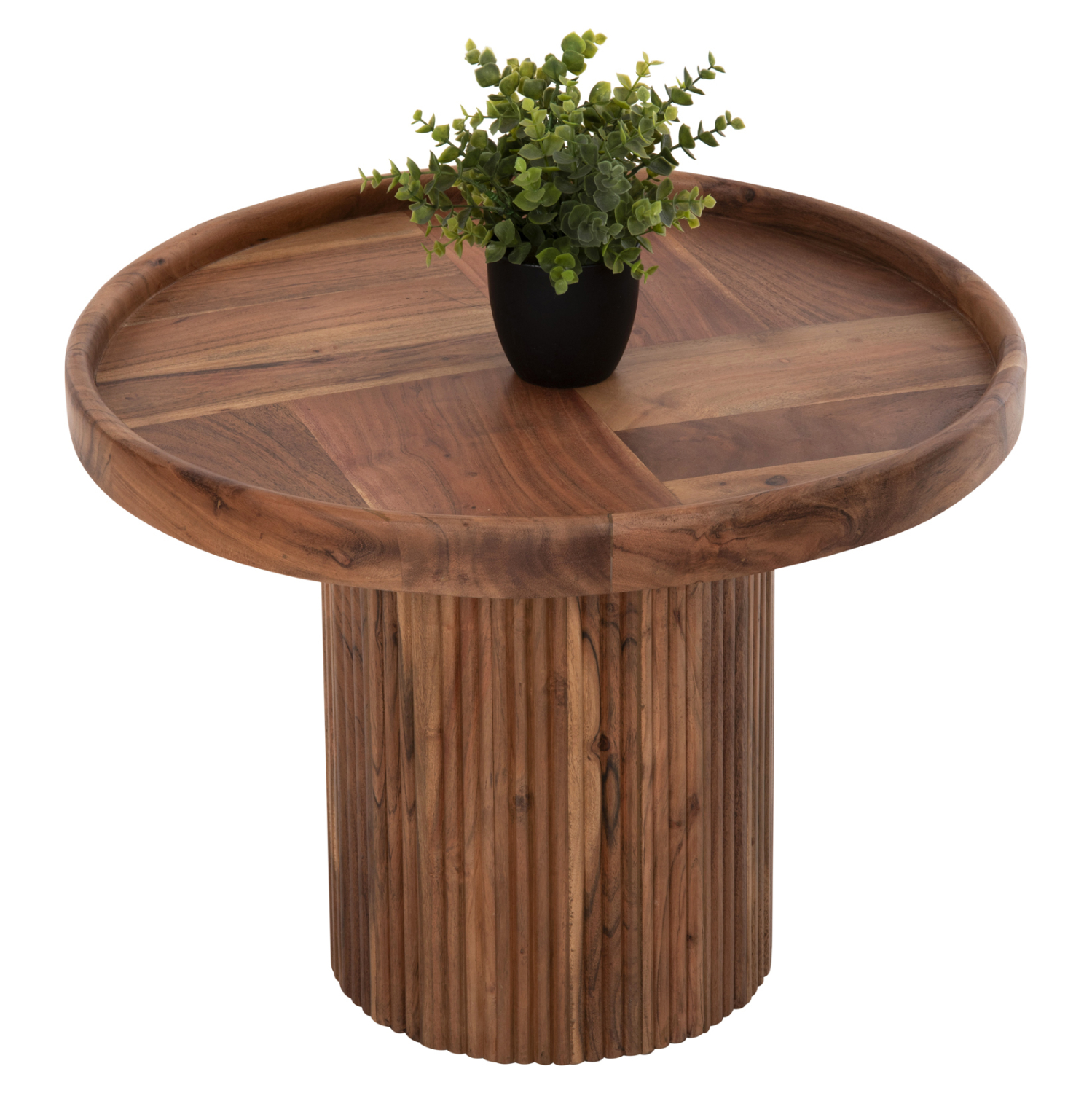 Το FB99693 είναι ένα στρογγυλό τραπέζι για το σαλόνι σε φυσικό χρώμα ξύλου. Το τραπέζι στηρίζεται σε μια ξύλινη κεντρική κυλινδρική κολώνα πάνω στην οποία μοντάρεται η στρογγυλή επιφάνεια από το ίδιο ποιοτικό μασίφ ξύλο. Πρόκειται για ένα χαμηλό τραπέζι με ελαφρώς υπερυψωμένη την περίμετρο της επιφάνειας.