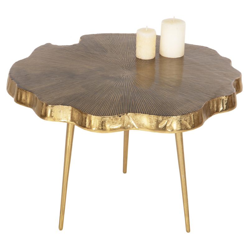 Το FB94263 είναι ένα τραπέζι σαλονιού με 3 πόδια, κατασκευασμένο εξολοκλήρου από μέταλλο σε ΧΡΥΣΟ και ΜΑΥΡΟ χρώμα. Η ιδιαιτερότητα αυτού του τραπεζιού είναι ότι προσομοιάζει μια «φέτα» από κορμό δέντρου γι’ αυτό και το σχήμα της επιφάνειάς του είναι ακανόνιστο. Αυτή η καινούργια προσθήκη στην γκάμα μας, θα δώσει μια εντελώς διαφορετική εικόνα στον χώρο σας.
