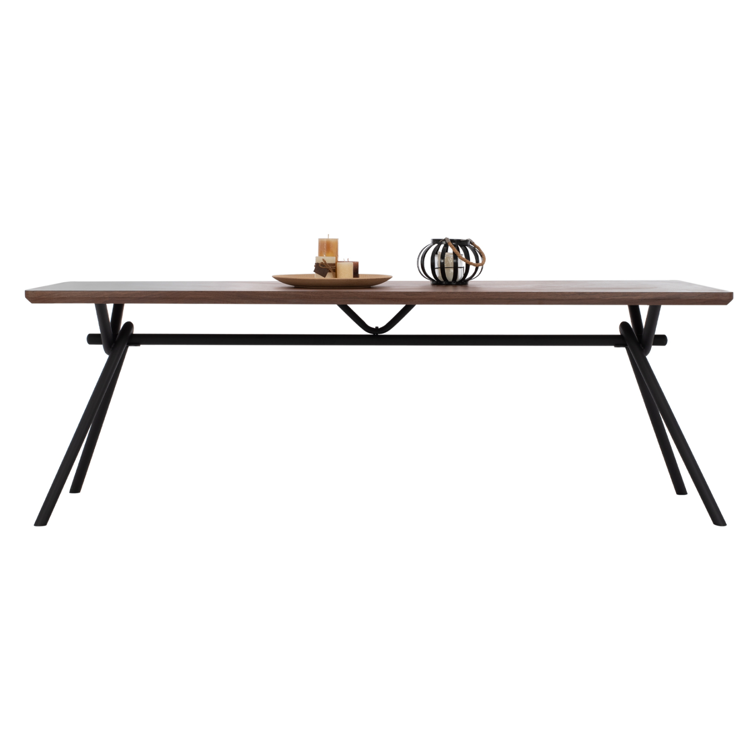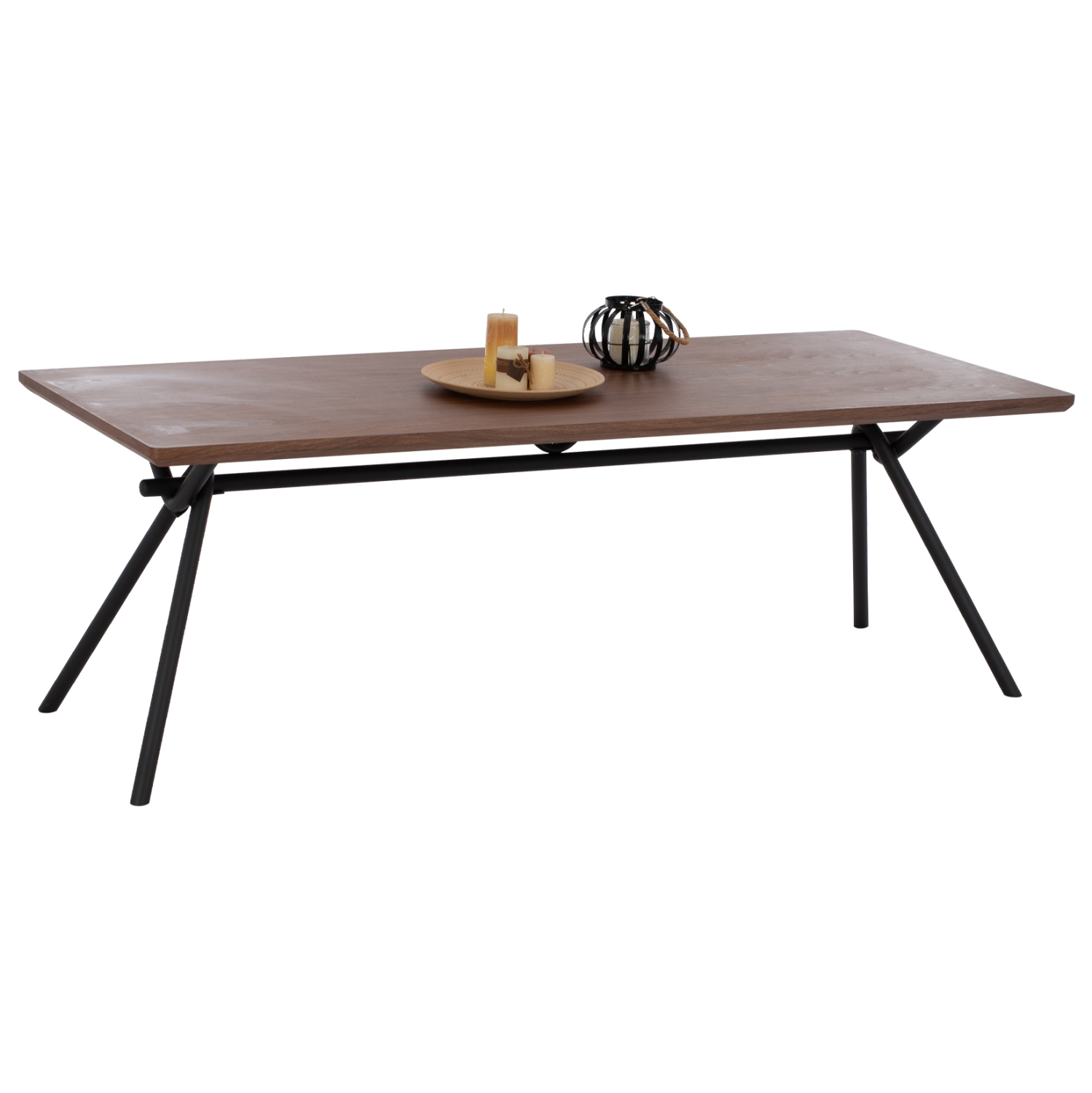 Το FB99303.02 είναι ένα μεγάλο ορθογώνιο τραπέζι για την τραπεζαρία, με επιφάνεια από MDF με καπλαμά από ξύλο καρυδιάς σε χρώμα σκούρο ΚΑΡΥΔΙ και στυλ ρουστίκ. Η επιφάνεια αυτή είναι «φαλτσοκομμένη»(δεν είναι δηλαδή τετραγωνισμένη) και στηρίζεται σε έναν μαύρο μεταλλικό σκελετόπλαίσιο με πόδια σε σχήμα πλαγιαστού Λ. Πρόκειται για ένα επιβλητικό τραπέζι σε μεγάλη διάσταση και με όμορφη διχρωμία, με αποτέλεσμα να μπορεί να ταιριάξει αισθητικά σχεδόν σε κάθε ανάλογο χώρο.