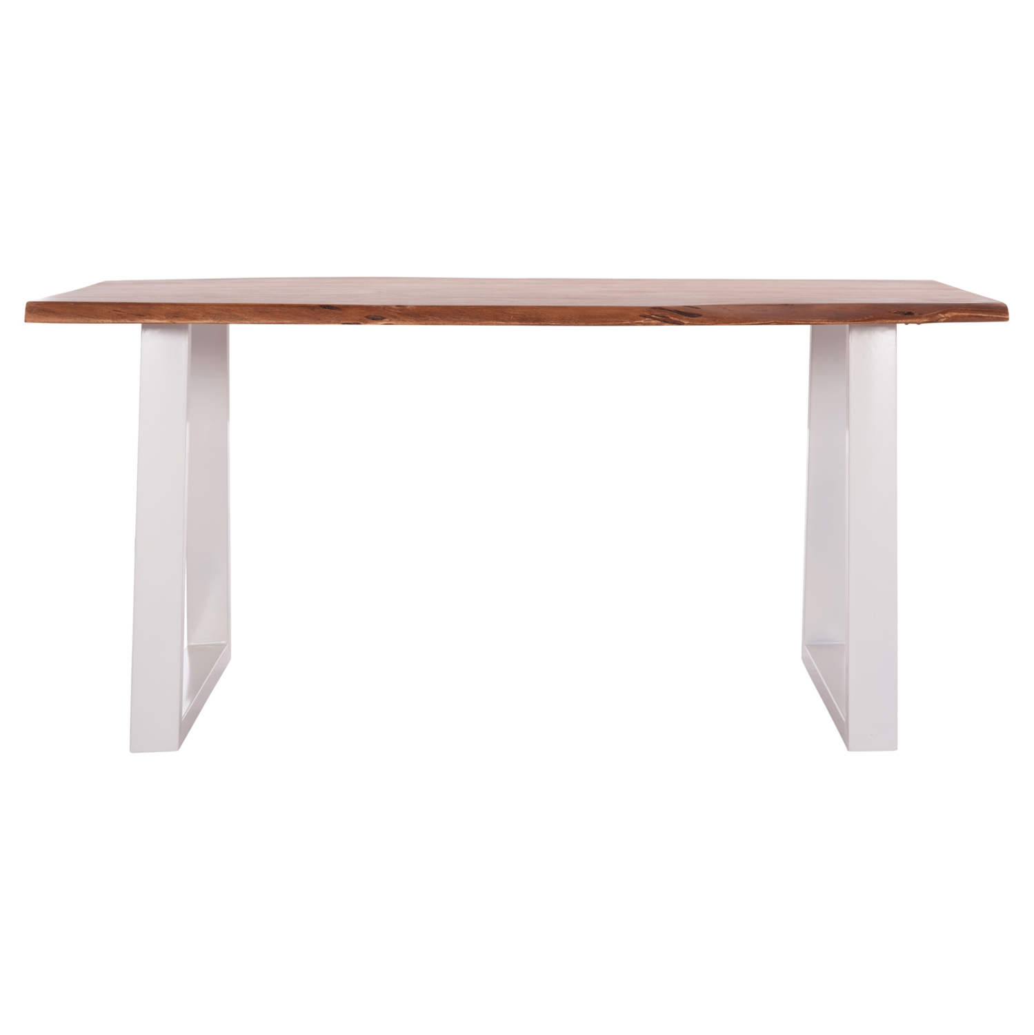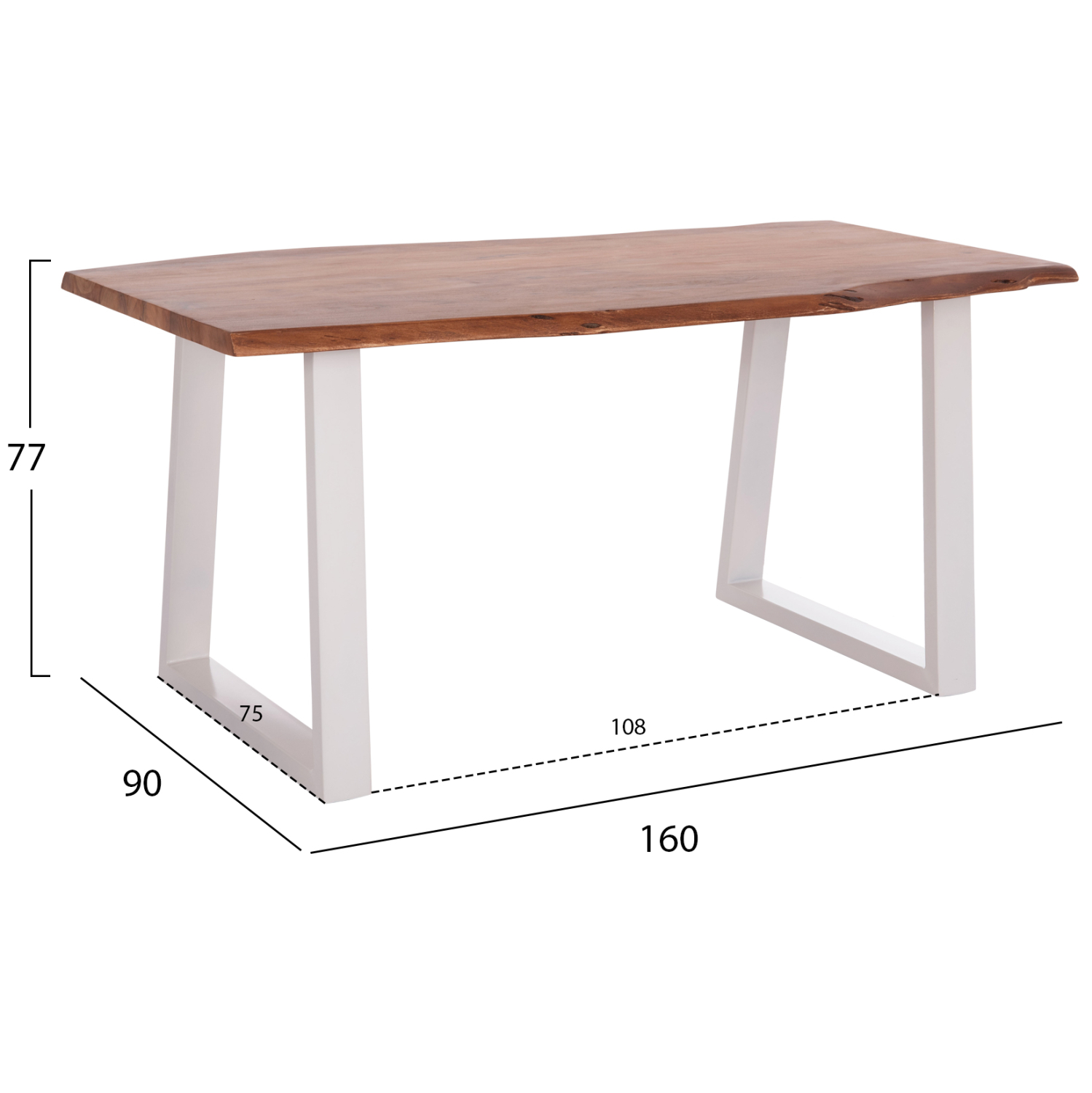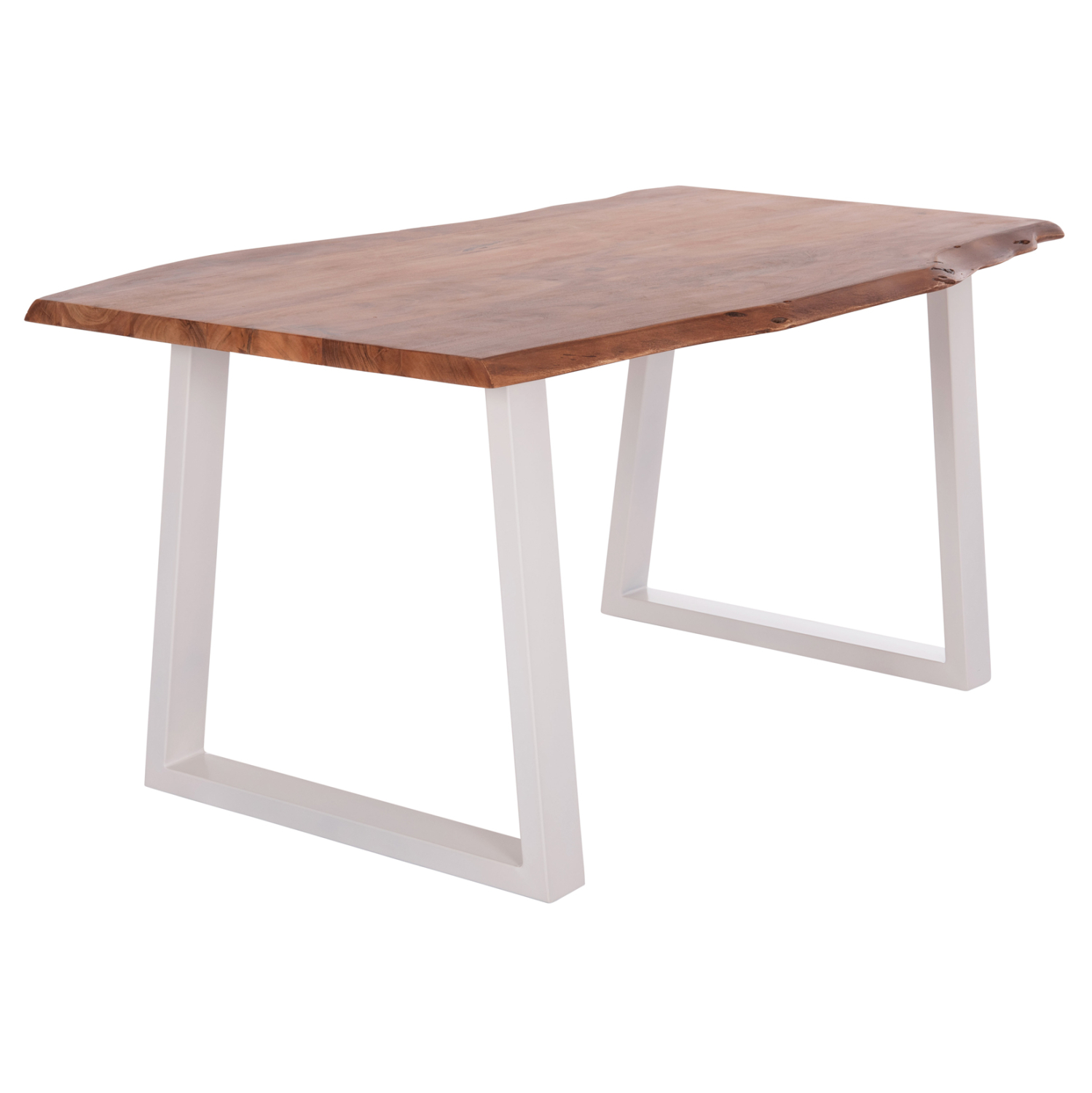 Το μοναδικό χειροποίητο τραπέζι FB98336.12 διαθέτει επιφάνεια από φυσικό μασίφ ξύλο ΑΚΑΚΙΑΣ σε ΦΥΣΙΚΟ χρώμα. To σχήμα είναι ορθογώνιο και στηρίζεται σε δύο ΛΕΥΚΕΣ μεταλλικές βάσεις με τραπεζοειδές σχήμα. Το μοντέρνο design συναντά την φύση και δίνει μια διαχρονική και ζεστή αίσθηση στον χώρο σας.