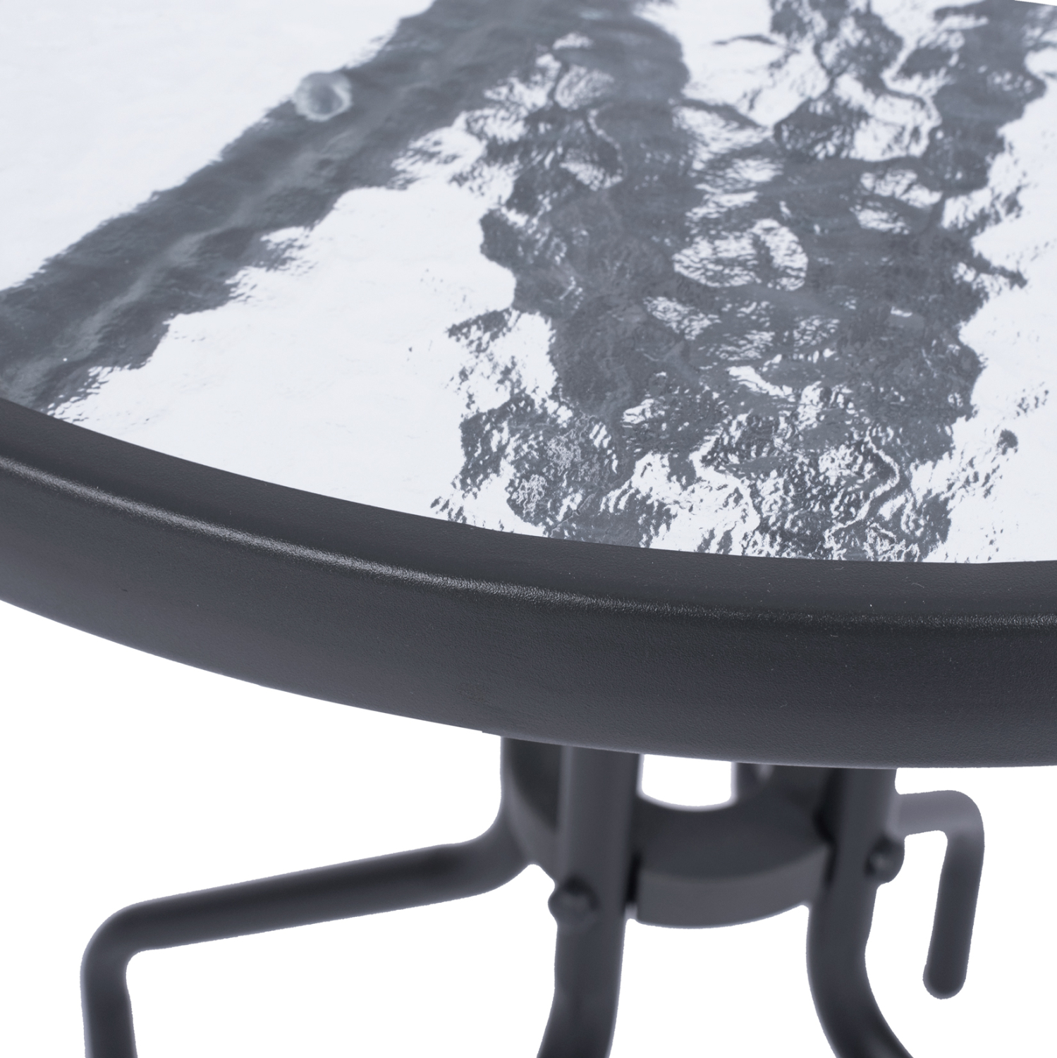 Τραπέζι εξωτερικού χώρου μεταλλικό σε γκρι απόχρωση με γυαλί ασφαλείας στην επιφάνειά του.