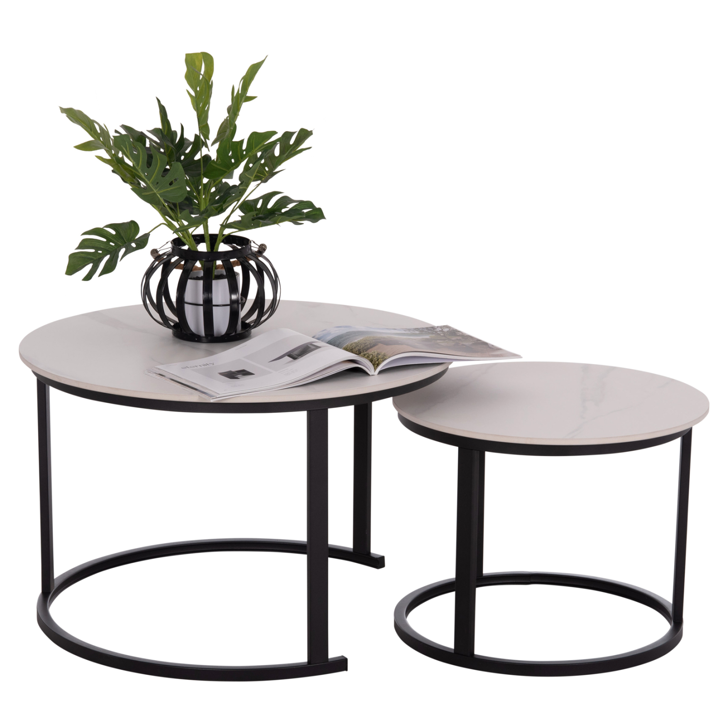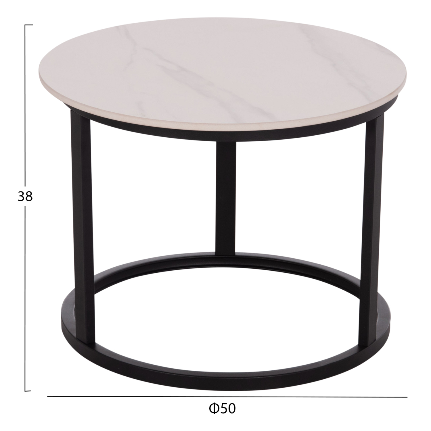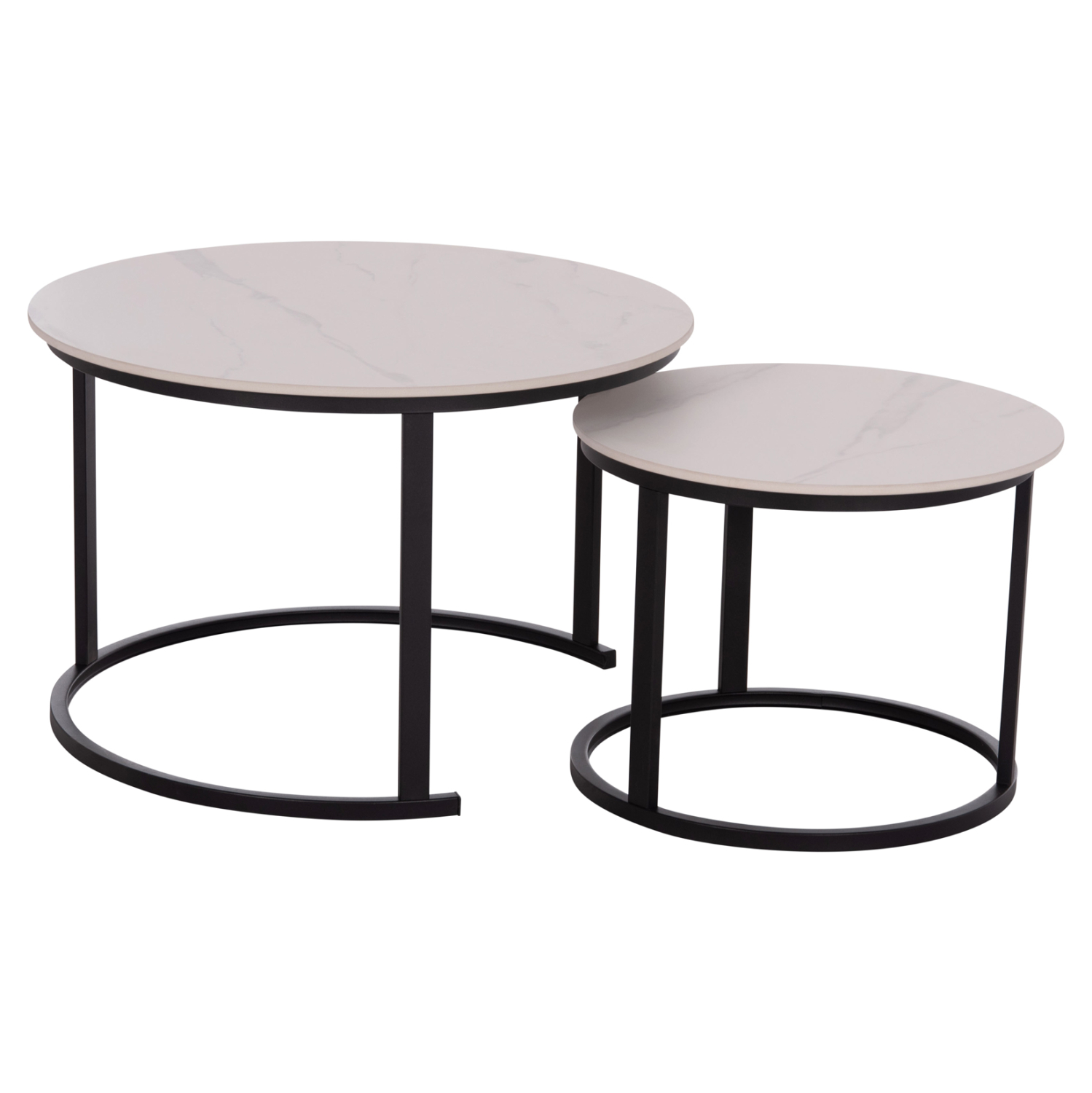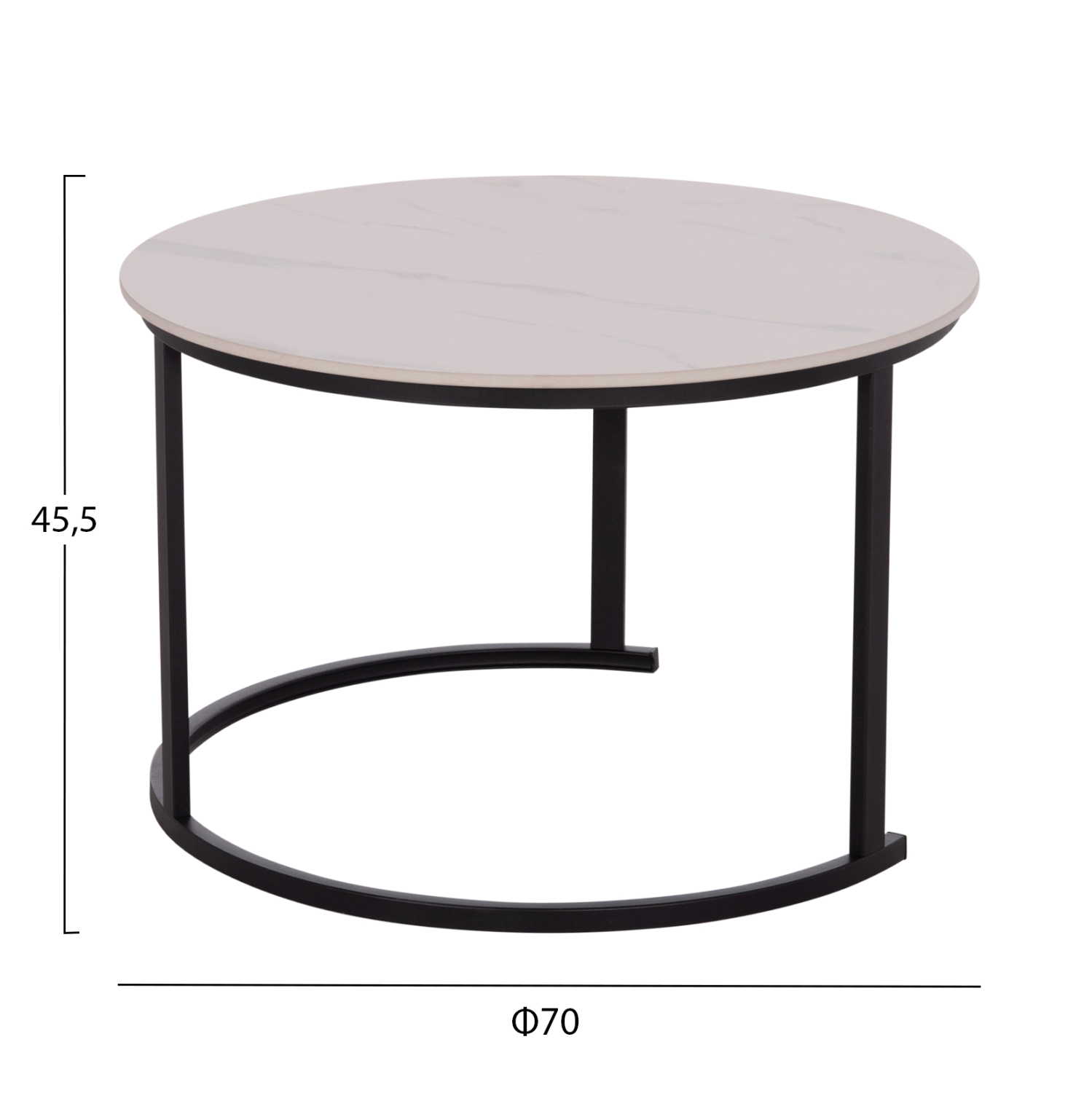 Τα τραπεζάκια FB918140.01 θα σας ενθουσιάσουν με το στυλ και την πρακτικότητά τους. Πρόκειται για 2 τραπεζάκια ένα ψηλότερο κι ένα πιο κοντό με ιδιαίτερο χαρακτηριστικό ότι το ψηλότερο στηρίζεται σε μια ημικυκλική βάση με τρία μεταλλικά πόδια, πράγμα που επιτρέπει στο πιο κοντό να χωράει και να αποθηκεύεται ακριβώς από κάτω. Οι βάσεις και των δύο τραπεζιών είναι μεταλλικές σε μαύρο χρώμα, ενώ οι επιφάνειές τους είναι κεραμικές σε χρωματισμό ΛΕΥΚΟΥ ΜΑΡΜΑΡΟΥ.