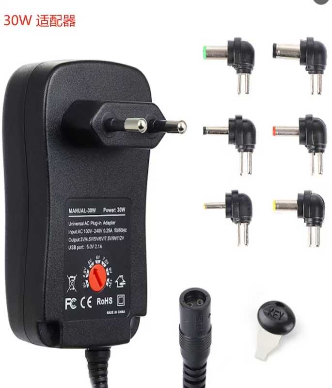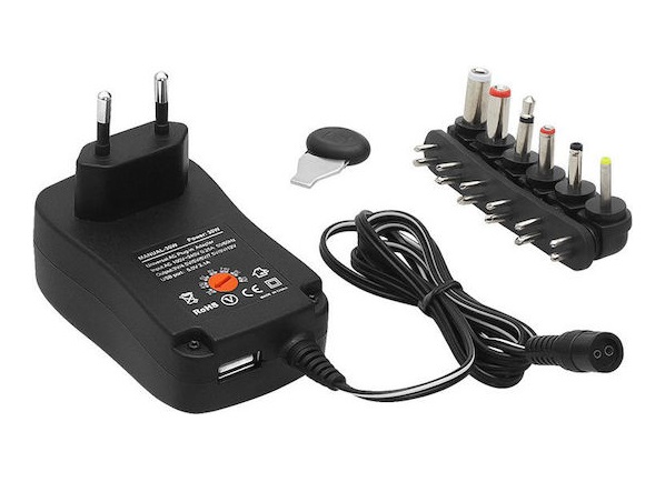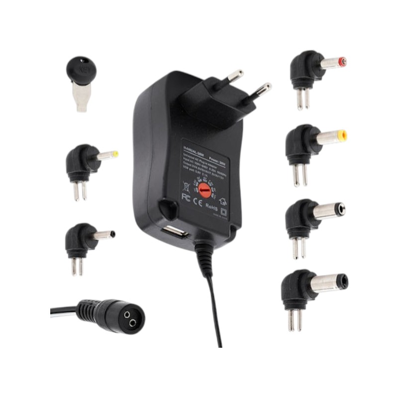 Τροφοδοτικό μετασχηματιστής AC/DC, με ρυθμιστή τάσης, θύρα USB και 6 διαφορετικά βύσματα, κατάλληλο για laptops και ηλεκτρονικές συσκευές που τροφοδοτούνται στα 3-12V. Input: AC 100~240V 50/60Hz Output: 3/4.5/5/6/7.5/9/12V Κλειδί ρύθμισης τάσης 6 αποσπώμενα βύσματα φόρτισης διαφορετικών τύπων. Υποδοχή USB 5V/2.1A Ισχύς: 30W Λυχνία LED.