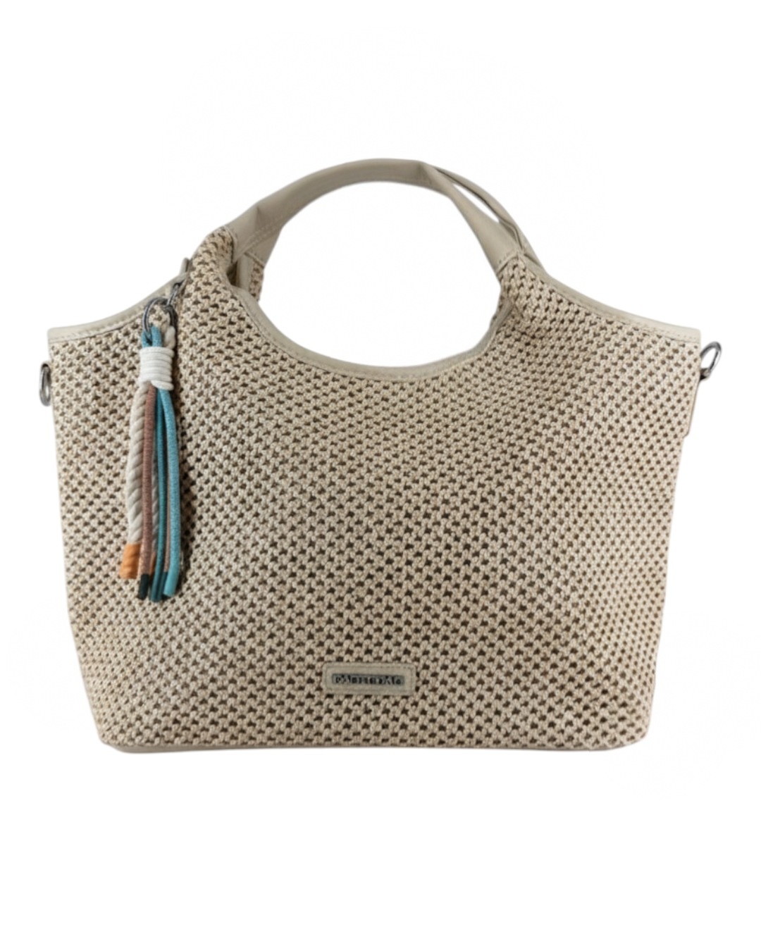 Κομψή γυναικεία τσάντα σε φυσική απόχρωση με ιδιαίτερη πλεκτή υφή