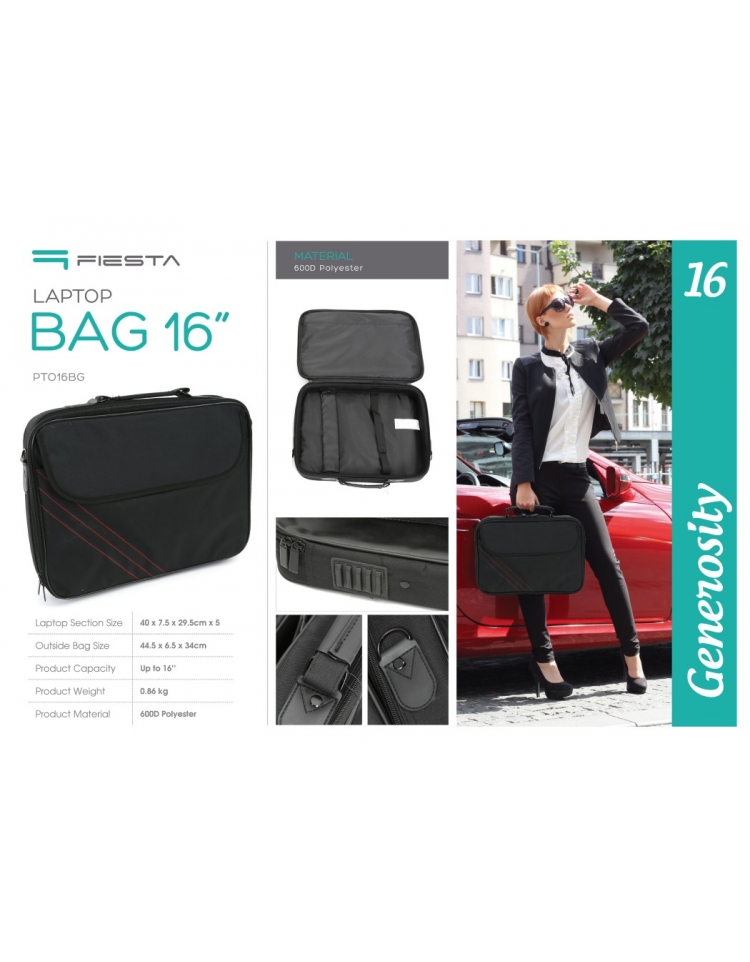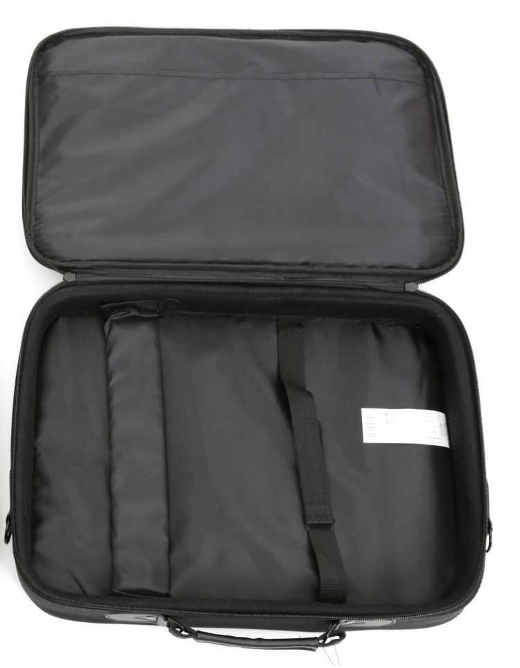 Στο μπροστινό μέρος υπάρχει ένα τμήμα με πτερύγιο velcro, ιδανικό για έγγραφα και μικρά αντικείμενα. Το κύριο μέρος της τσάντας έχει σκληρό πλαίσιο και είναι κατασκευασμένο από μαλακό και ανθεκτικό σε τριβή υλικό. Διαθέτει ελεύθερα ρυθμιζόμενο μαλακό διάφραγμα που σας επιτρέπει να ρυθμίσετε τις εσωτερικές του διαστάσεις ώστε να ταιριάζει στο μέγεθος του φορητού υπολογιστή. Ο πρόσθετος χώρος μέσα στην τσάντα μπορεί να χρησιμοποιηθεί ως τμήμα για αξεσουάρ ή τροφοδοτικό. Το κυρίως τμήμα διαθέτει επίσης εσωτερική τσέπη για έγγραφα. Η τσάντα έχει μεταλλικά φερμουάρ, έναν ιμάντα για στερέωση της τσάντας στη λαβή της θήκης και έναν ρυθμιζόμενο ιμάντα ώμου. Τέλος έχει ελαστικά ποδαράκια στην βάση της. Χαρακτηριστικά Προϊόντος: Διαστάσεις για φορητούς υπολογιστές: 40 x 29,5 x 5 cm Εξωτερικές διαστάσεις: 44,5 x 34 x 6,5cm Βάρος του προϊόντος: 0,87 kg Υφάσματα: 600D Πολυεστέρας + PU