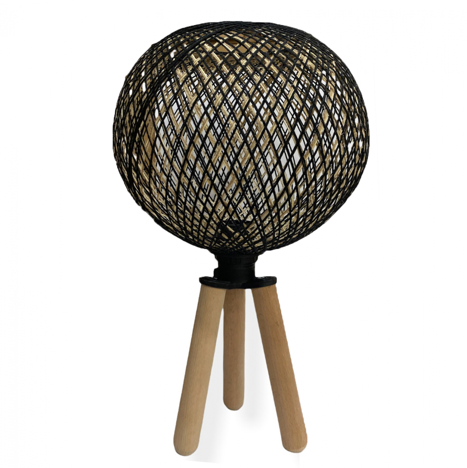 Το φωτιστικό είναι κατασκευασμένο από ξύλο και το καπέλο είναι επενδυμένο με λεπτό σκοινί πλεκτής γιούτας, υψηλής ποιότητας και αντοχής στο χρόνο, σε μαύρη απόχρωση.