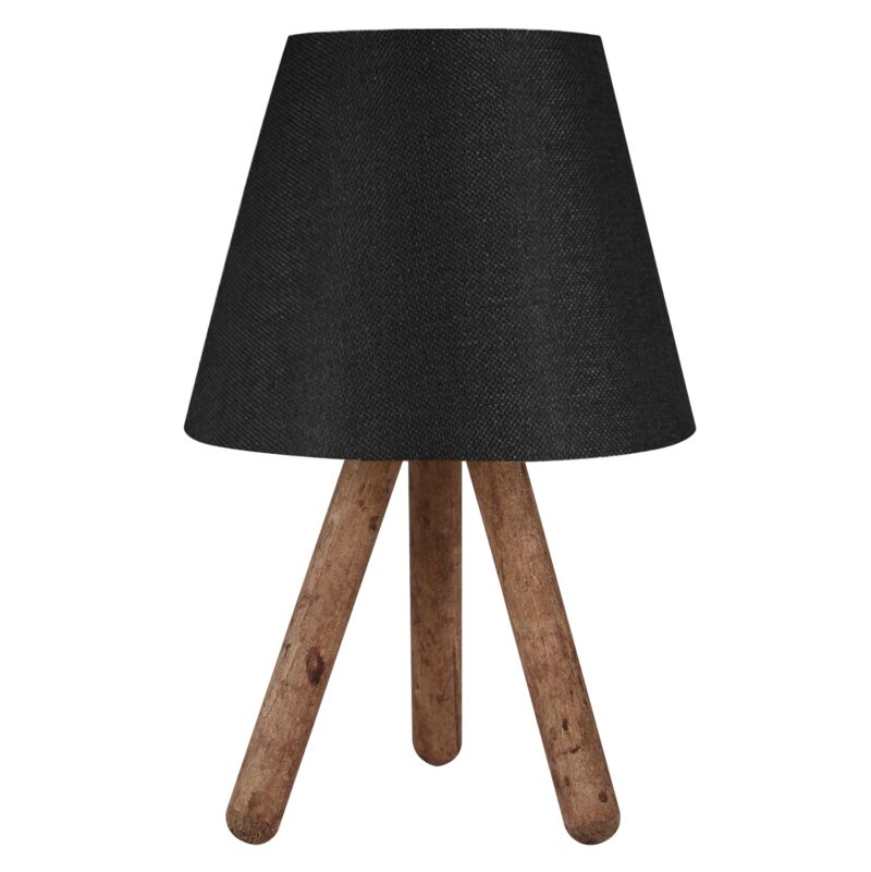 Ένα πολύ ιδιαίτερο και μοντέρνο επιτραπέζιο φωτιστικό. Δεν έχει την κλασική βάση ενός επιτραπέζιου φωτιστικού αλλά στέκεται σε ένα ξύλινο τρίποδο με το καπέλο του να στηρίζεται στην κορυφή του τρίποδου. Η σχεδίαση παραπέμπει περισσότερο σε επιδαπέδιο φωτιστικό παρά σε ένα επιτραπέζιο. Τα πόδια έχουν το μέγεθος και την μορφή σκυτάλης σε καφέ χρωματισμό, ενώ το καπέλο του φωτιστικού είναι μαύρο και έχει κυκλικό και τραπεζοειδές σχήμα. Αυτού του είδους τα φωτιστικά δεν προορίζονται για φωτιστικά διαβάσματος και αυτό πρέπει πάντα να λαμβάνεται υπόψη κατά την επιλογή τους. Είναι καθαρά διακοσμητικά και το ταίριασμά τους με τον περιβάλλοντα χώρο θα πρέπει να είναι αρμονικό. Αυτό το φωτιστικό είναι μοντέρνο, κομψό και βολικό σε διαστάσεις παρέχοντας αμέτρητες δυνατότητες «δεσίματος» με την υπόλοιπη διακόσμησή σας. Είναι ένα μικρό έργο τέχνης.