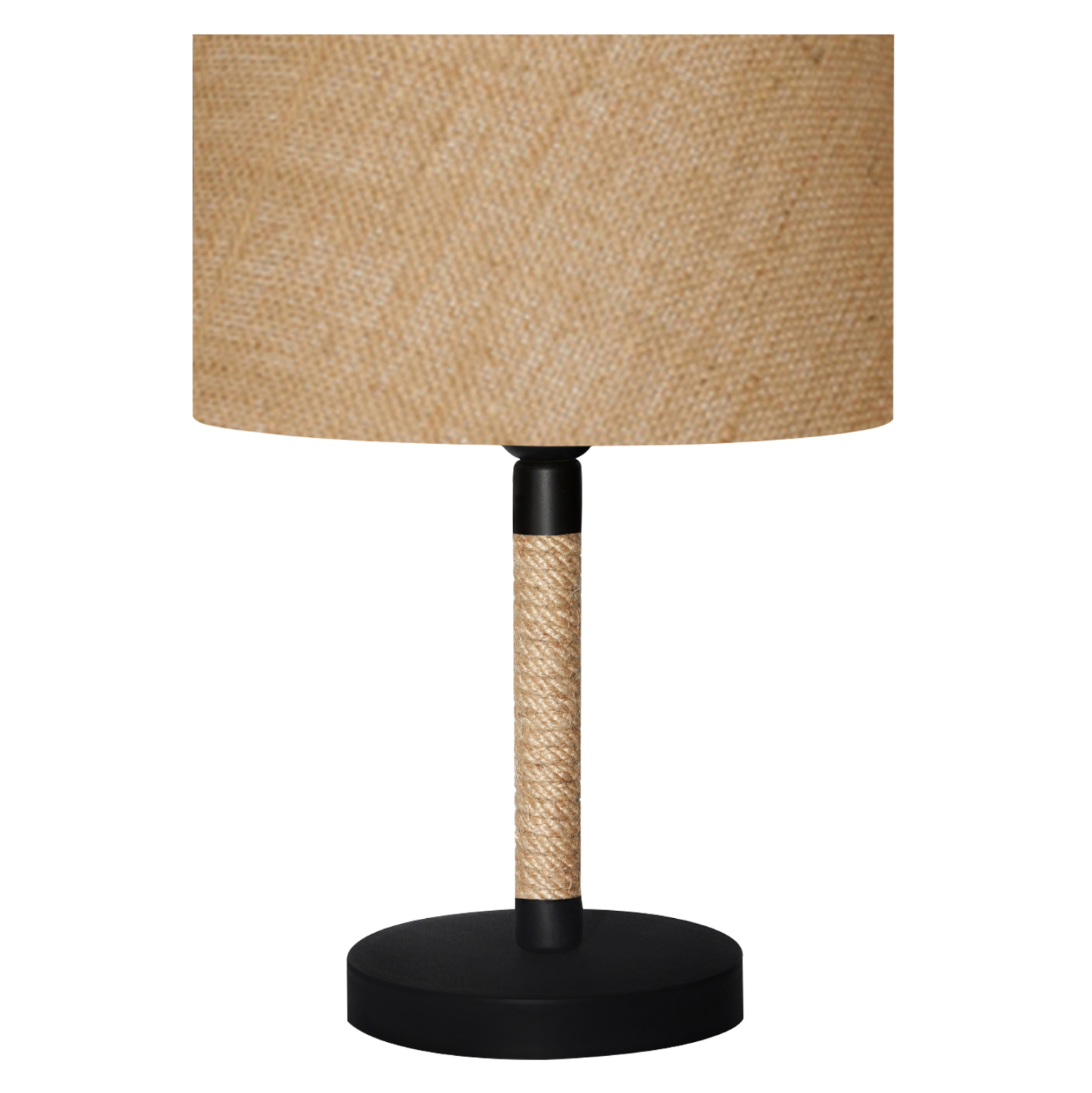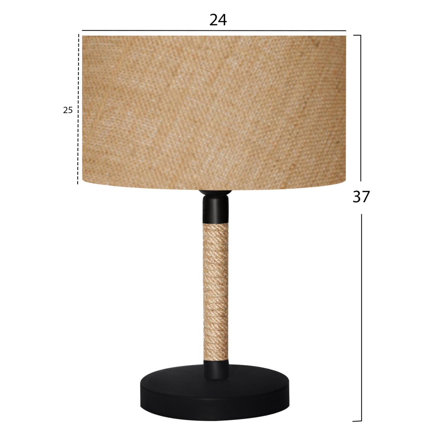 Μοντέρνο επιτραπέζιο φωτιστικό με μαύρη κυκλική βάση και τύμπανο σε χρώμα μπεζ της άμμου. Η ιδιαίτερη πινελιά αυτού του φωτιστικού που προσδίδει φινέτσα και την αίσθηση της περιπέτειας στο τραπέζι ή το γραφείο σας, είναι η κολώνα τυλιγμένη με σχοινί. Ένα λιτό και κομψό φωτιστικό που διαχέει γλυκά το φως και δημιουργεί την ατμόσφαιρα που πάντα φανταζόσασταν για τον χώρο σας, έτσι ώστε να φτιάξετε την δική σας γωνιά χαλάρωσης ή ακόμα και διακόσμησης. Διότι το φως, σημαίνει κάτι περισσότερο από ένα φωτιστικό. Σημαίνει διακόσμηση, ατμόσφαιρα, τέχνη, μεράκι, και φυσικά επιστήμη.