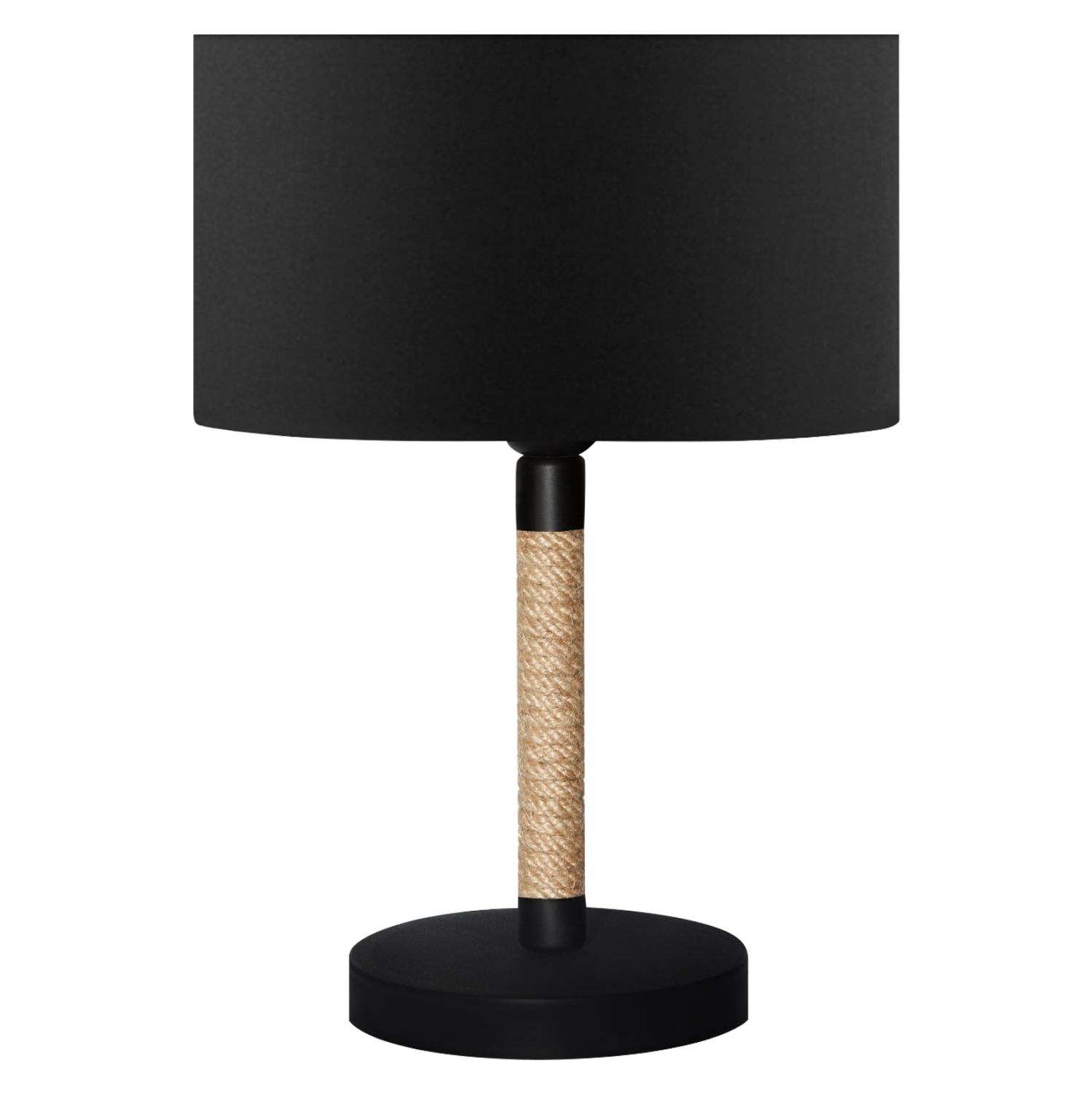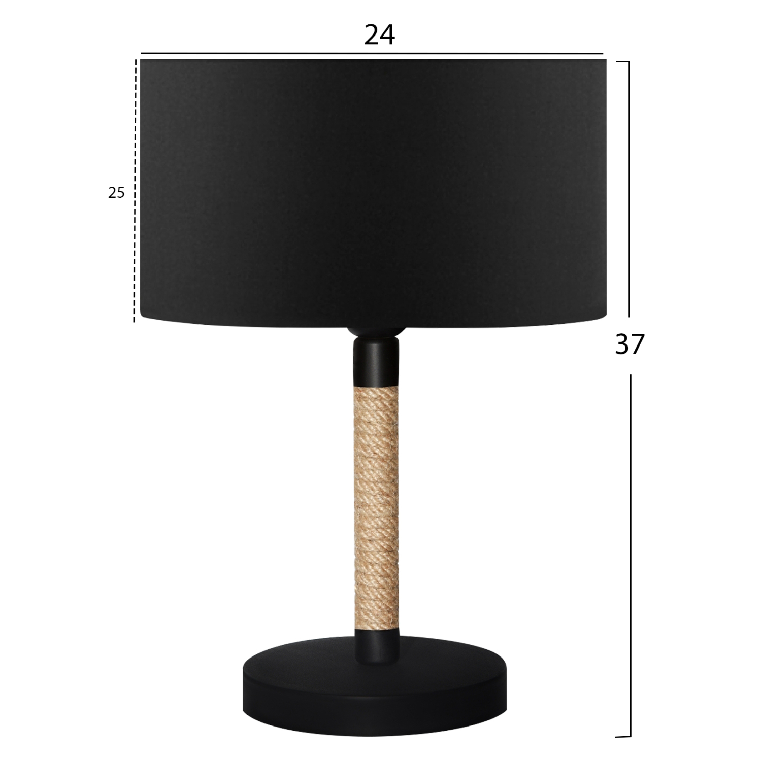 Μοντέρνο επιτραπέζιο φωτιστικό με μαύρη κυκλική βάση και μαύρο τύμπανο. Η ιδιαίτερη πινελιά αυτού του φωτιστικού που προσδίδει φινέτσα και την αίσθηση της περιπέτειας στο τραπέζι ή το γραφείο σας, είναι η κολώνα τυλιγμένη με σχοινί. Ένα λιτό και κομψό φωτιστικό που διαχέει γλυκά το φως και δημιουργεί την ατμόσφαιρα που πάντα φανταζόσασταν για τον χώρο σας, έτσι ώστε να φτιάξετε την δική σας γωνιά χαλάρωσης ή ακόμα και διακόσμησης. Διότι το φως, σημαίνει κάτι περισσότερο από ένα φωτιστικό. Σημαίνει διακόσμηση, ατμόσφαιρα, τέχνη, μεράκι, και φυσικά επιστήμη.