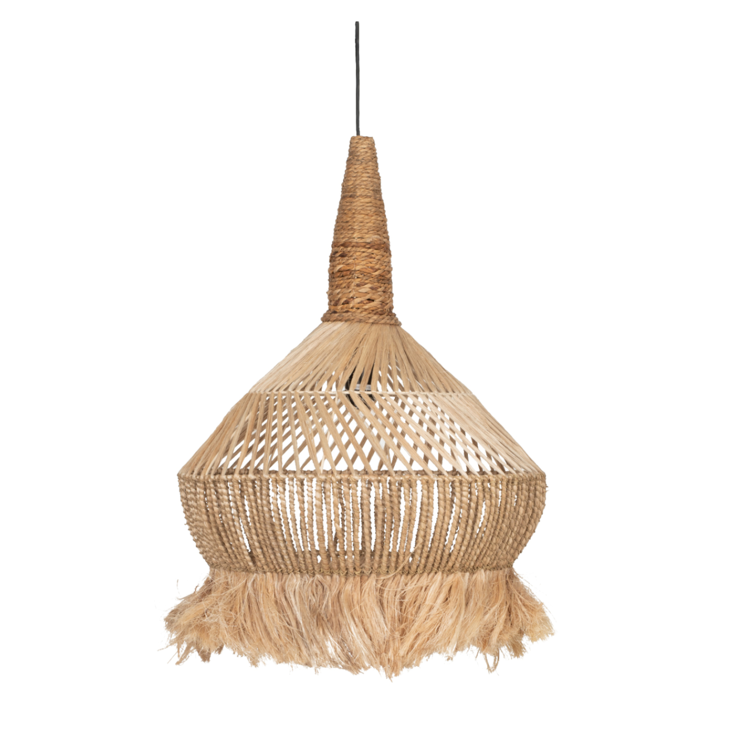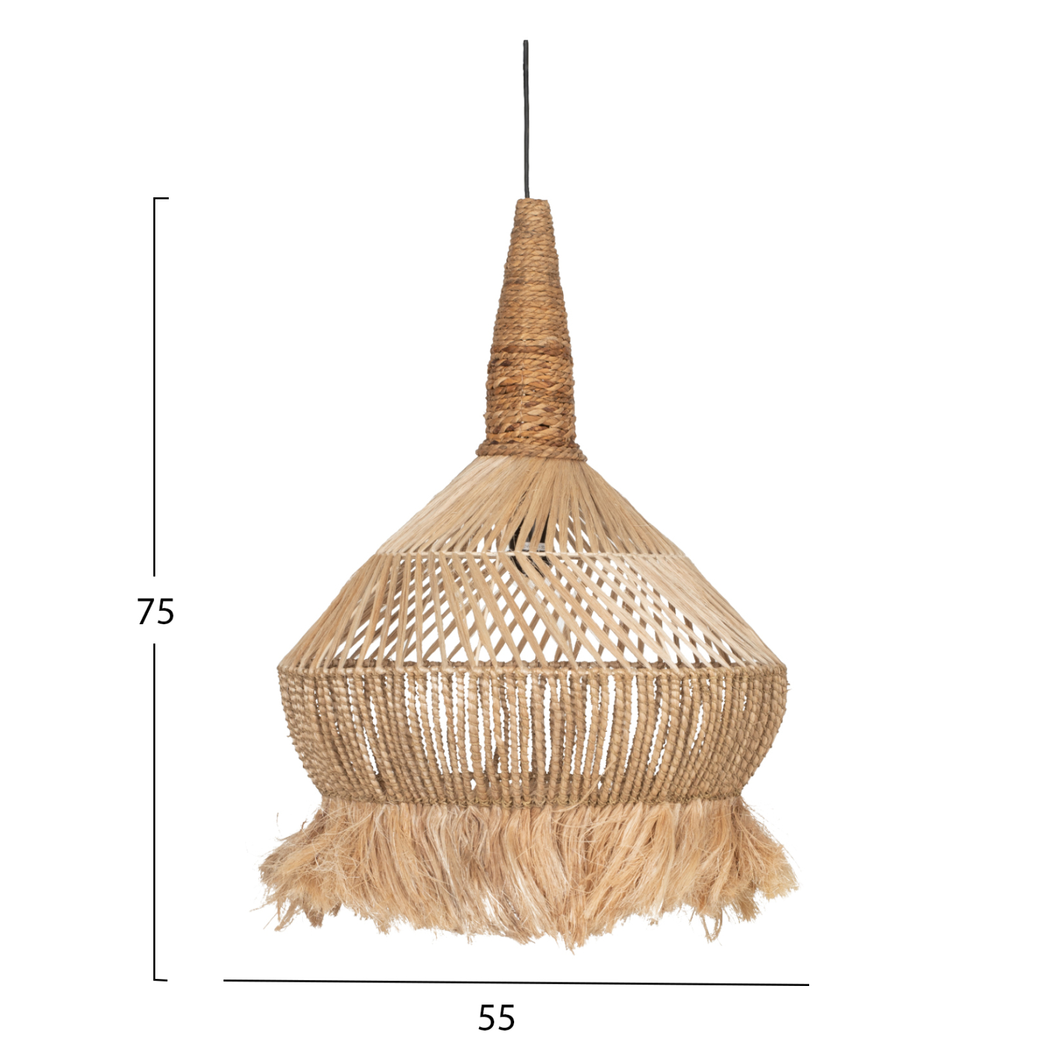 FB97774- Kρεμαστό φωτιστικό—- Αν επιθυμείτε να διακοσμήσετε το χώρο σας με ένα φωτιστικό σε boho στυλ, αυτό θα σας ενθουσιάσει. Είναι ένα μονόφωτο φωτιστικό με περίτεχνο «καπέλο» φτιαγμένο από σκοινί και ίνες κάνναβης Μανίλας και μπανάνας. Το ιδιαίτερο χαρακτηριστικό, όμως, αυτού του φωτιστικού είναι ότι το «καπέλο» καταλήγει σε κρόσια, επιτείνοντας ακόμα περισσότερο το boho στυλ.