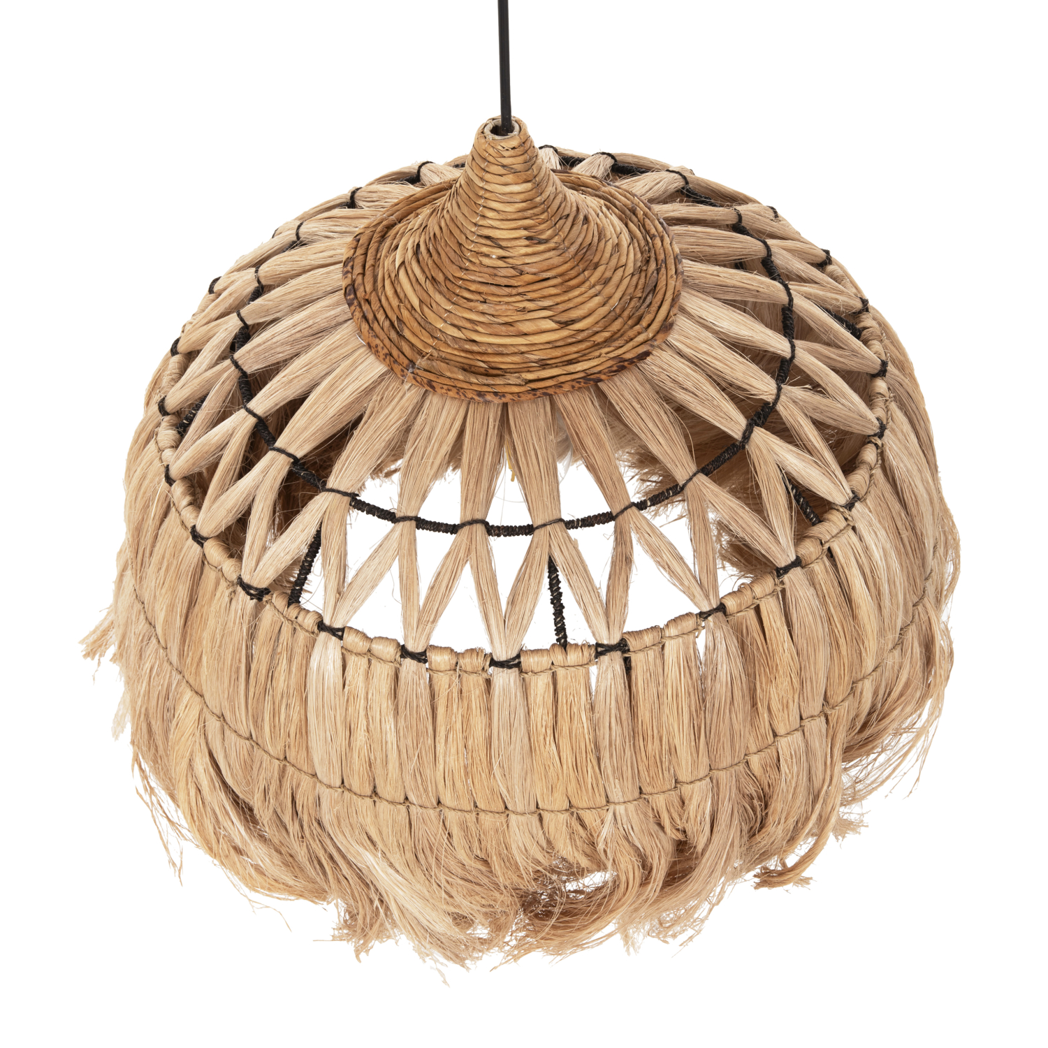 FB97760- Kρεμαστό φωτιστικό—- Αν επιθυμείτε να διακοσμήσετε το χώρο σας με ένα φωτιστικό σε boho στυλ, αυτό είναι μια χαρακτηριστική επιλογή. Είναι ένα μονόφωτο φωτιστικό με «καπέλο» σε σχήμα καμπάνας φτιαγμένο από ίνες κάνναβης Μανίλας σε φυσικό χρώμα. Το ιδιαίτερο χαρακτηριστικό αυτού του φωτιστικού είναι ότι στο επάνω μέρος του καπέλου οι ίνες είναι πλεγμένες με χιαστί τρόπο δίνοντας μια άλλη αισθητική στο φωτιστικό.