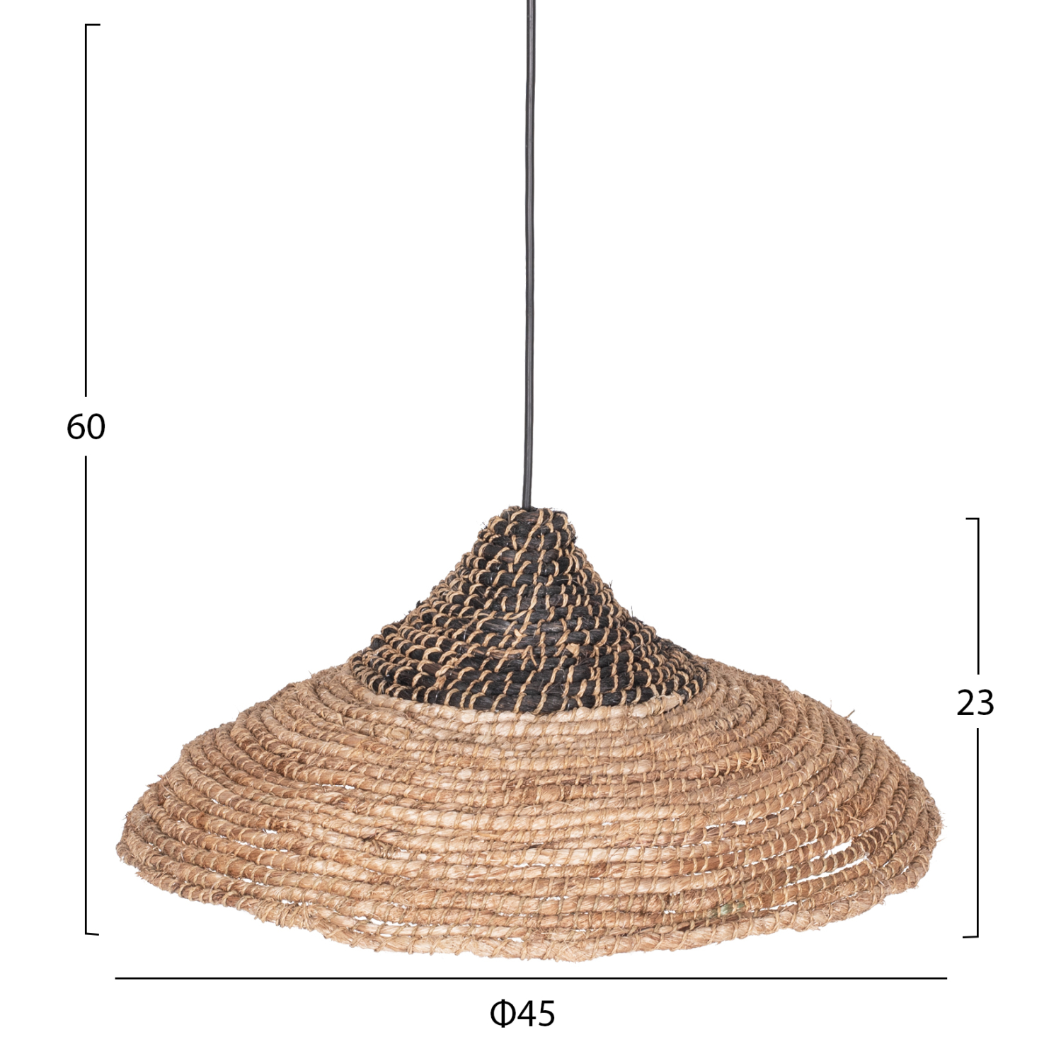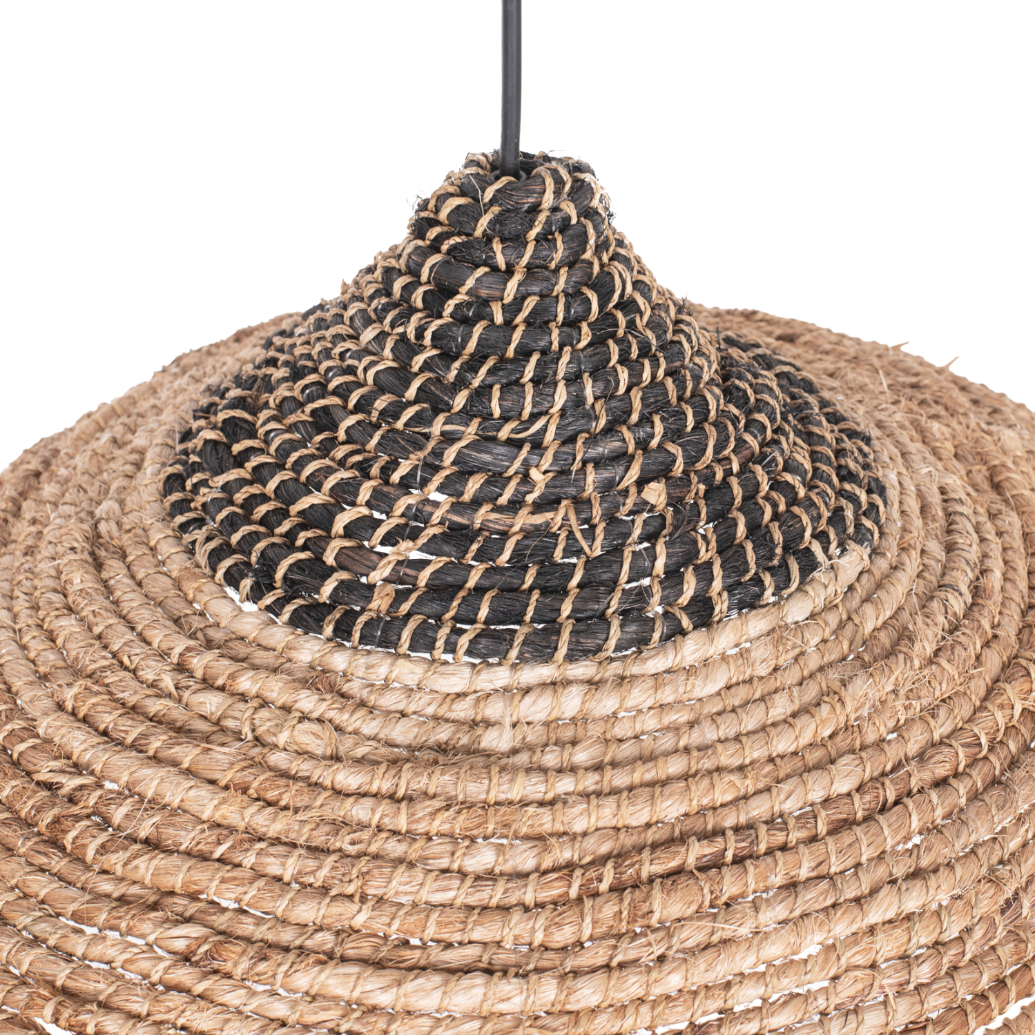 FB97785- Kρεμαστό φωτιστικό—- Αν επιθυμείτε να διακοσμήσετε το χώρο σας με ένα φωτιστικό από φυσικά υλικά, αυτό είναι μια χαρακτηριστική επιλογή. Είναι ένα μονόφωτο φωτιστικό με φαρδύ «καπέλο» σε ανοιχτό σχήμα και φυσικό χρώμα, ενώ η κορυφή του καπέλου είναι φτιαγμένη από μαύρες ανακυκλωμένες ίνες, ολόκληρο φτιαγμένο από σκοινί από ίνες κάνναβης Μανίλας.