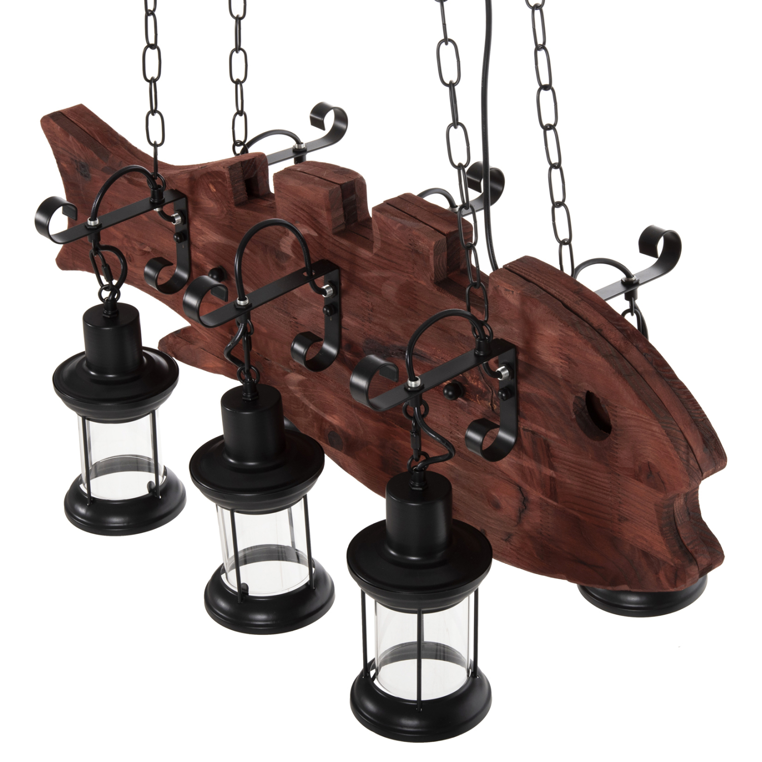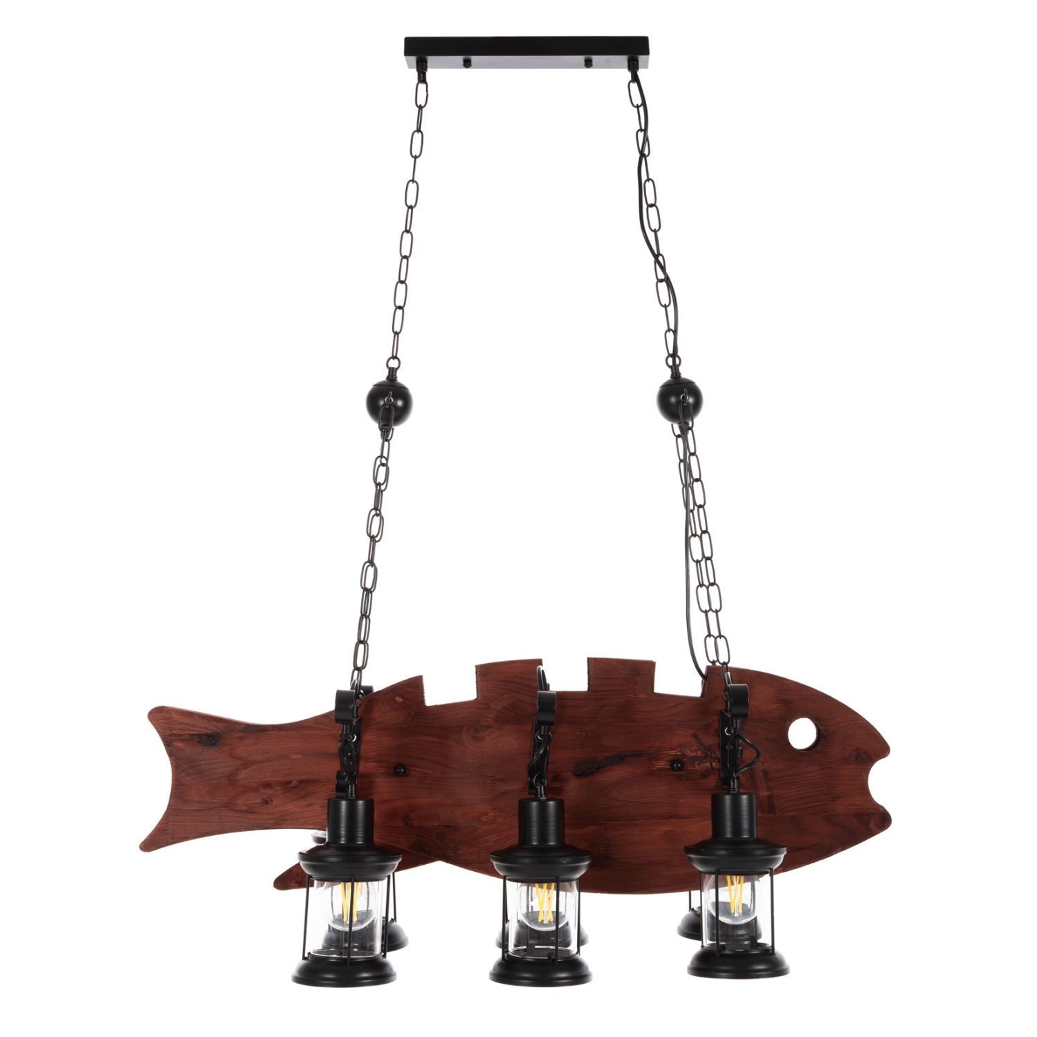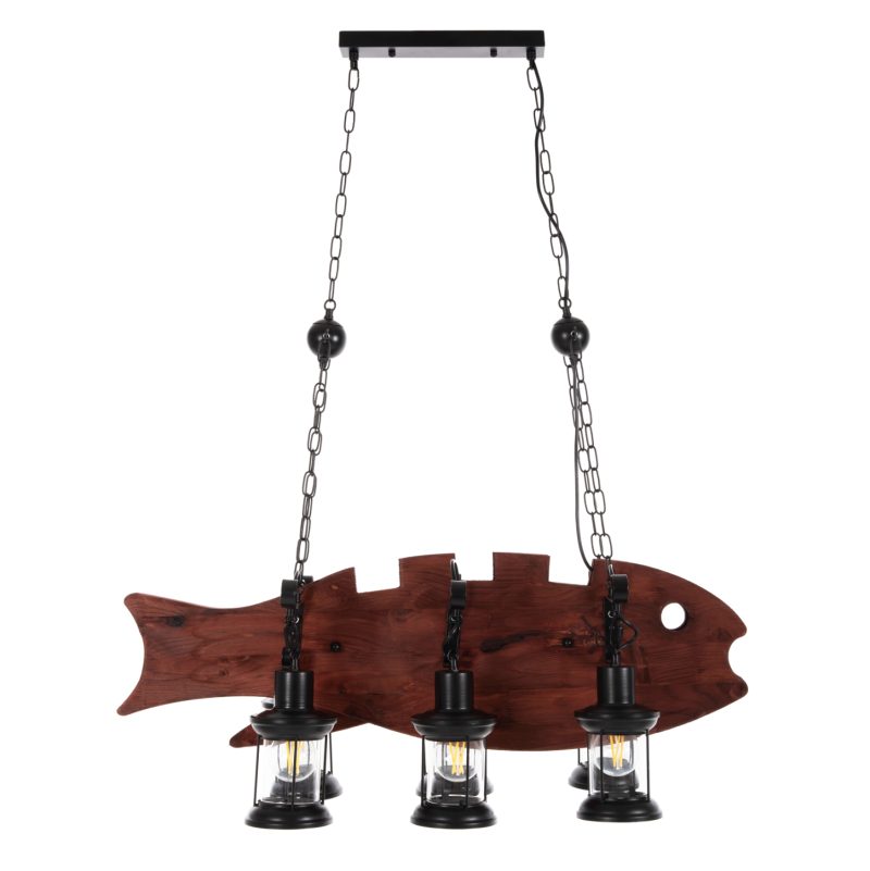 Ανακαλύψτε το εντυπωσιακό 6-φωτο φωτιστικό οροφής FB94118. Ένα φωτιστικό που θα αποτελέσει το κέντρο του ενδιαφέροντος χάρη στο εντυπωσιακό και εμπνευσμένο του design. Τα 6 φαναράκια που περιέχουν τους λαμπτήρες κρέμονται με όμορφες μεταλλικές κρεμάστρες από μια ξύλινη πλάκα με την μορφή ΨΑΡΙΟΥ, η οποία με την σειρά της κρέμεται από την οροφή με αλυσίδες.