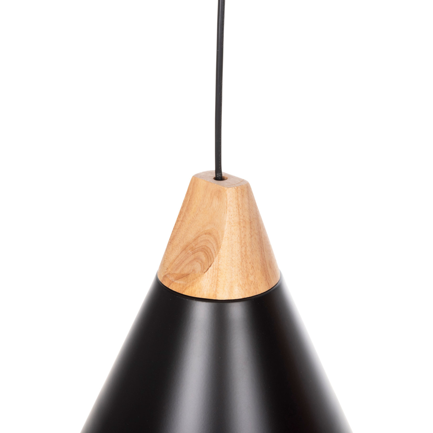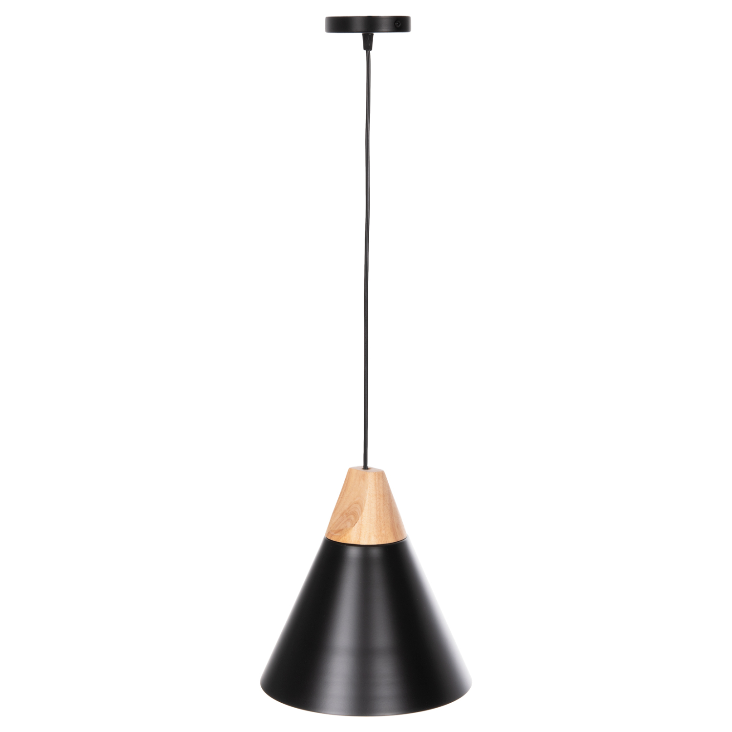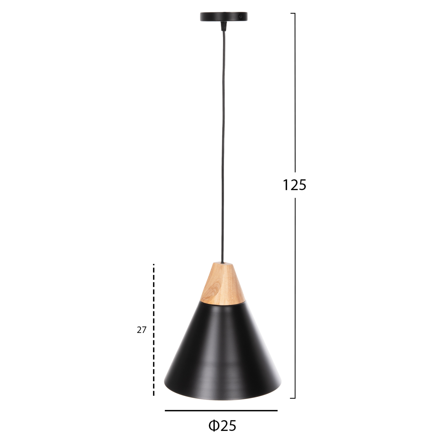 Ανακαλύψτε αυτό το νέο μας κρεμαστό φωτιστικό οροφής και ολοκληρώστε την διακόσμησή σας. Πρόκειται για ένα φωτιστικό με ΜΑΥΡΟ μεταλλικό καπέλο σε σχήμα καμπάνας με λεπτομέρεια ξύλου στην κορυφή του φωτιστικού. Αισθητικά, ολοκληρώνεται με το λευκό καλώδιο κρέμασης και την λευκή βάση οροφής, και αποτελεί την τελευταία τάση στα φωτιστικά οροφής.