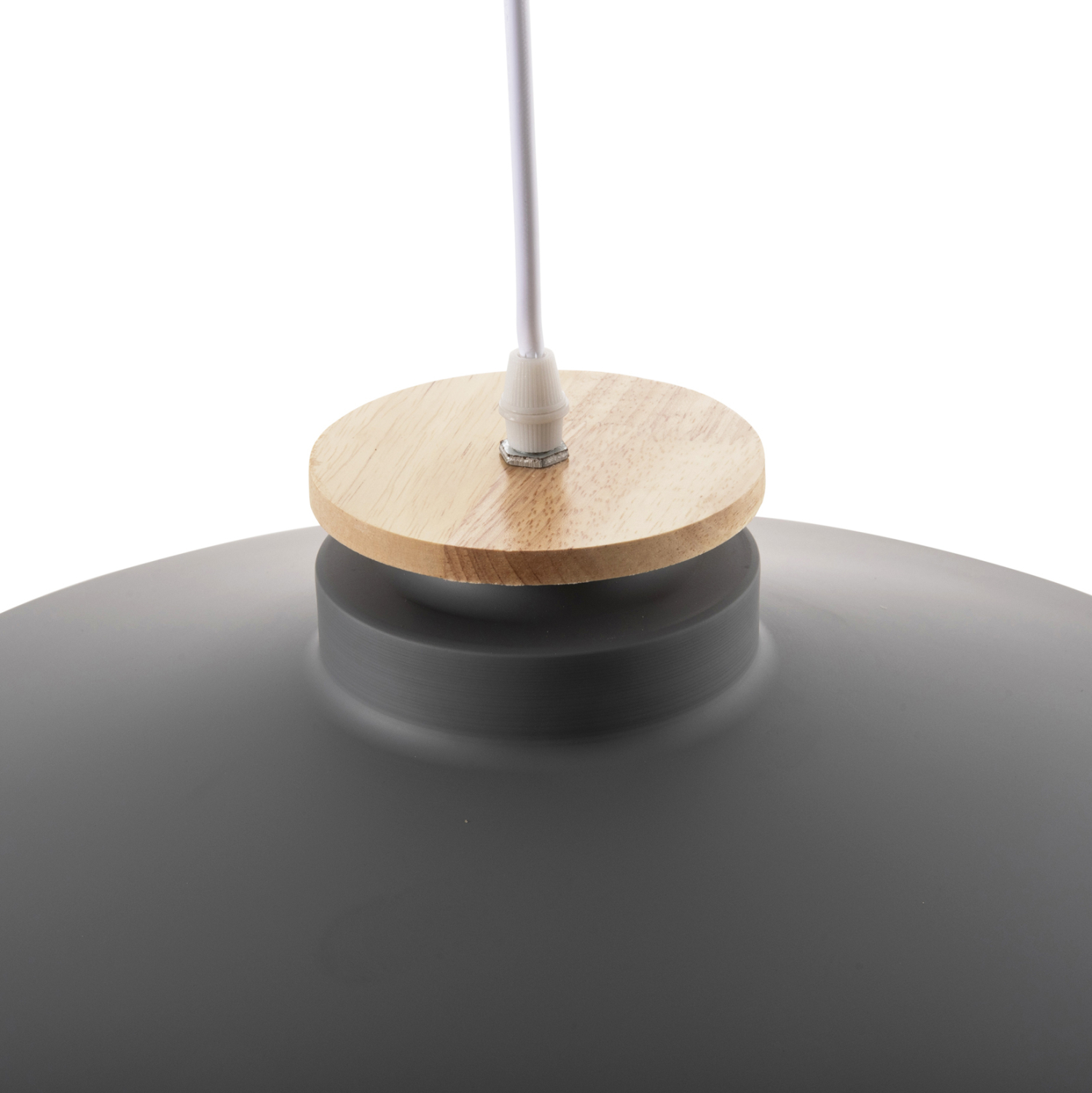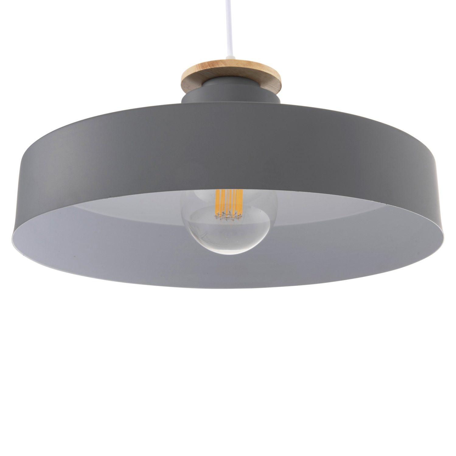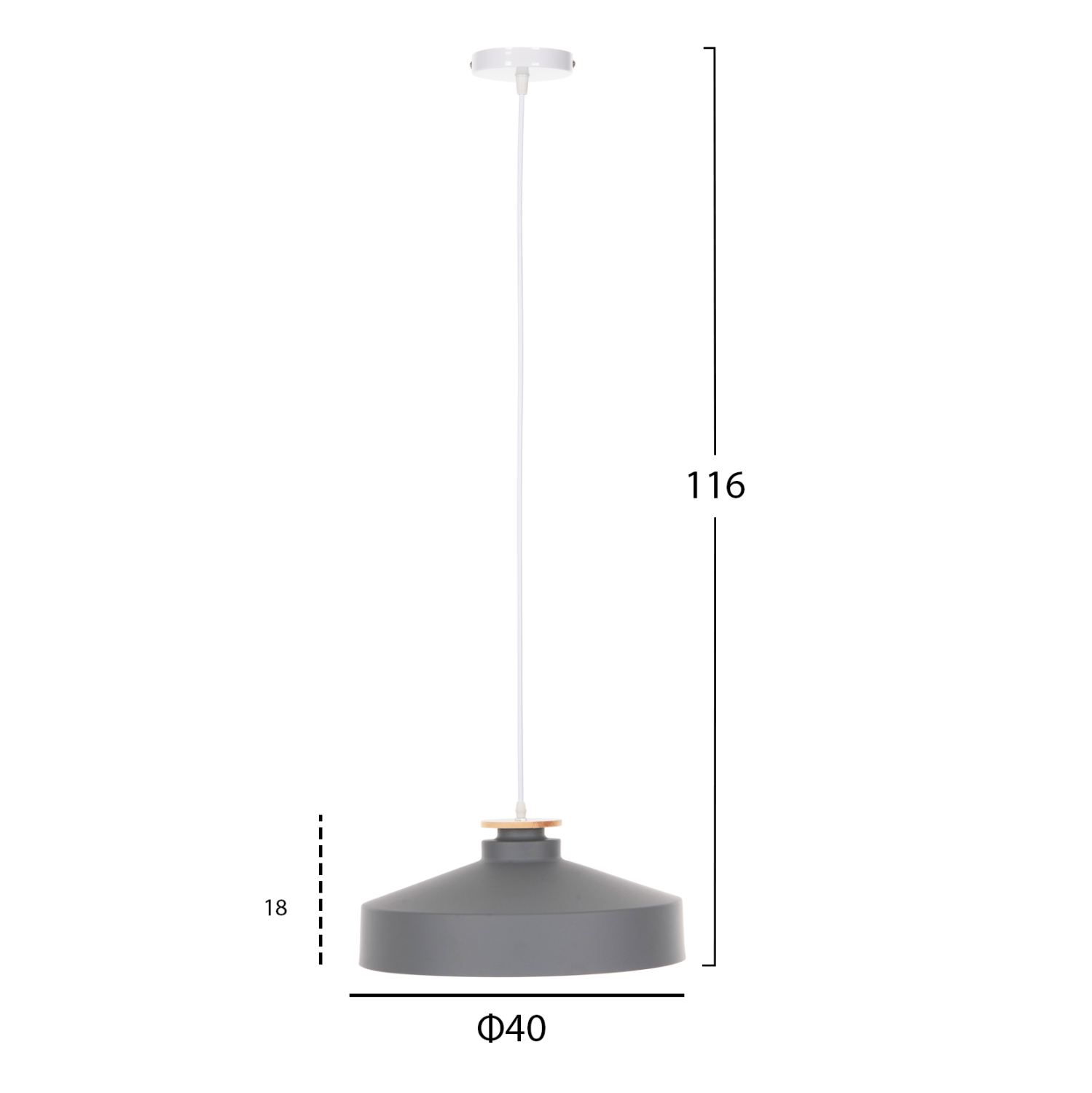 Ανακαλύψτε αυτό το νέο μας κρεμαστό φωτιστικό οροφής και ολοκληρώστε την διακόσμησή σας. Πρόκειται για ένα φωτιστικό με ΓΚΡΙ ρηχό μεταλλικό καπέλο σε σχήμα καμπάνας με λεπτομέρεια ξύλου στην κορυφή του φωτιστικού. Αισθητικά, ολοκληρώνεται με το λευκό καλώδιο κρέμασης και την λευκή βάση οροφής, και αποτελεί την τελευταία τάση στα φωτιστικά οροφής.