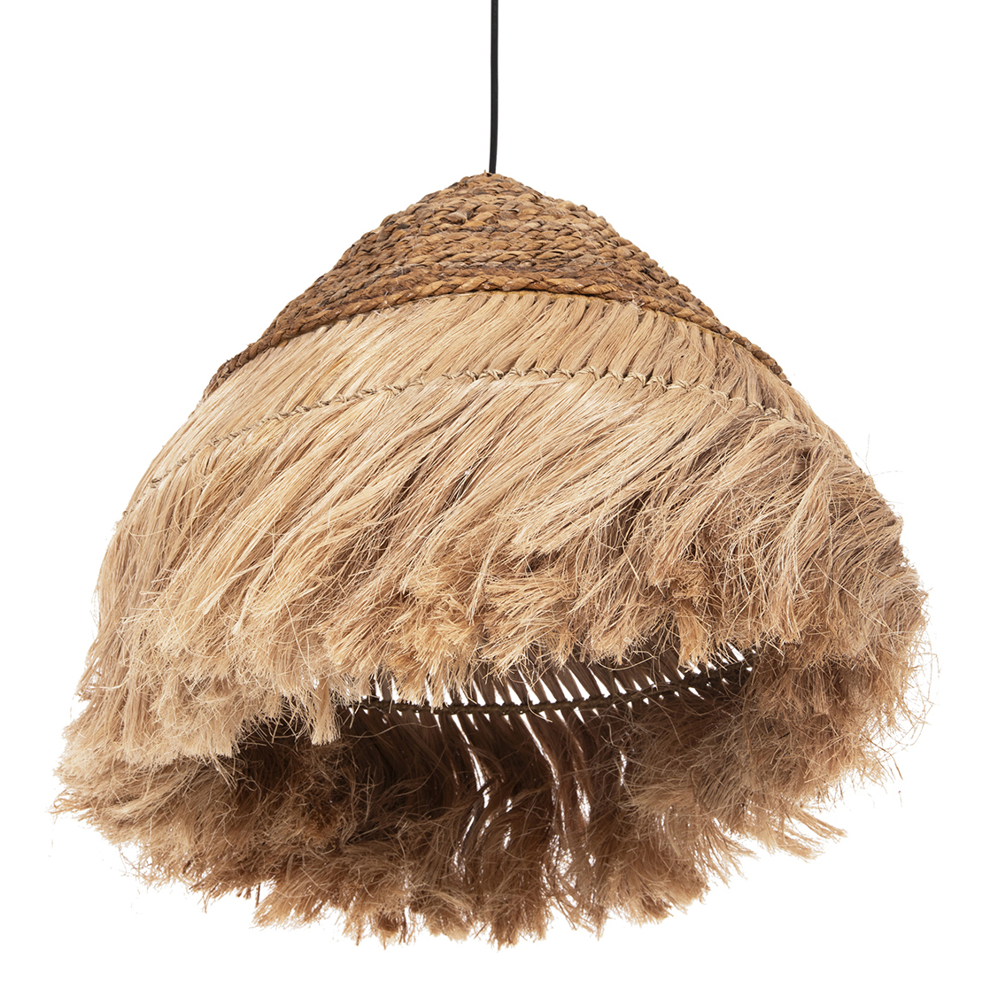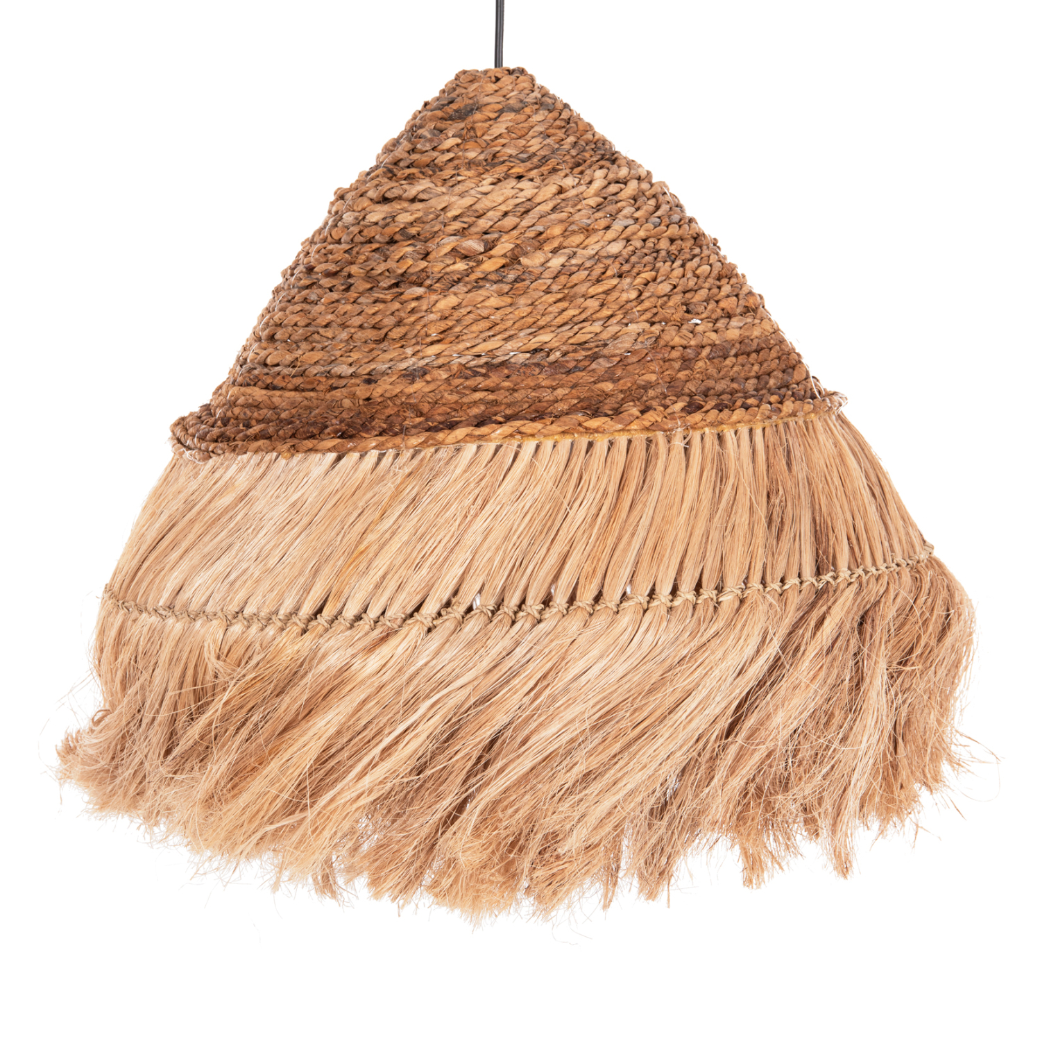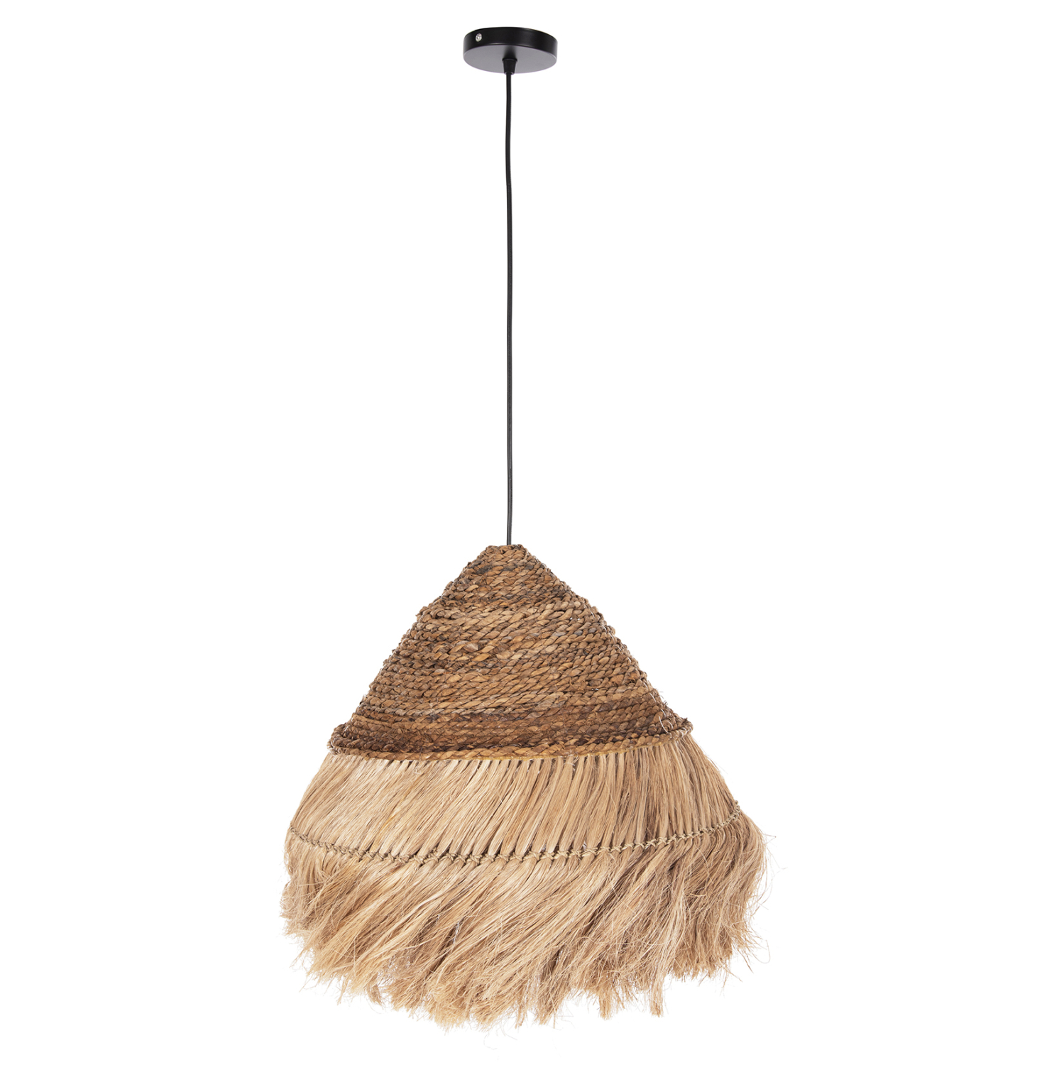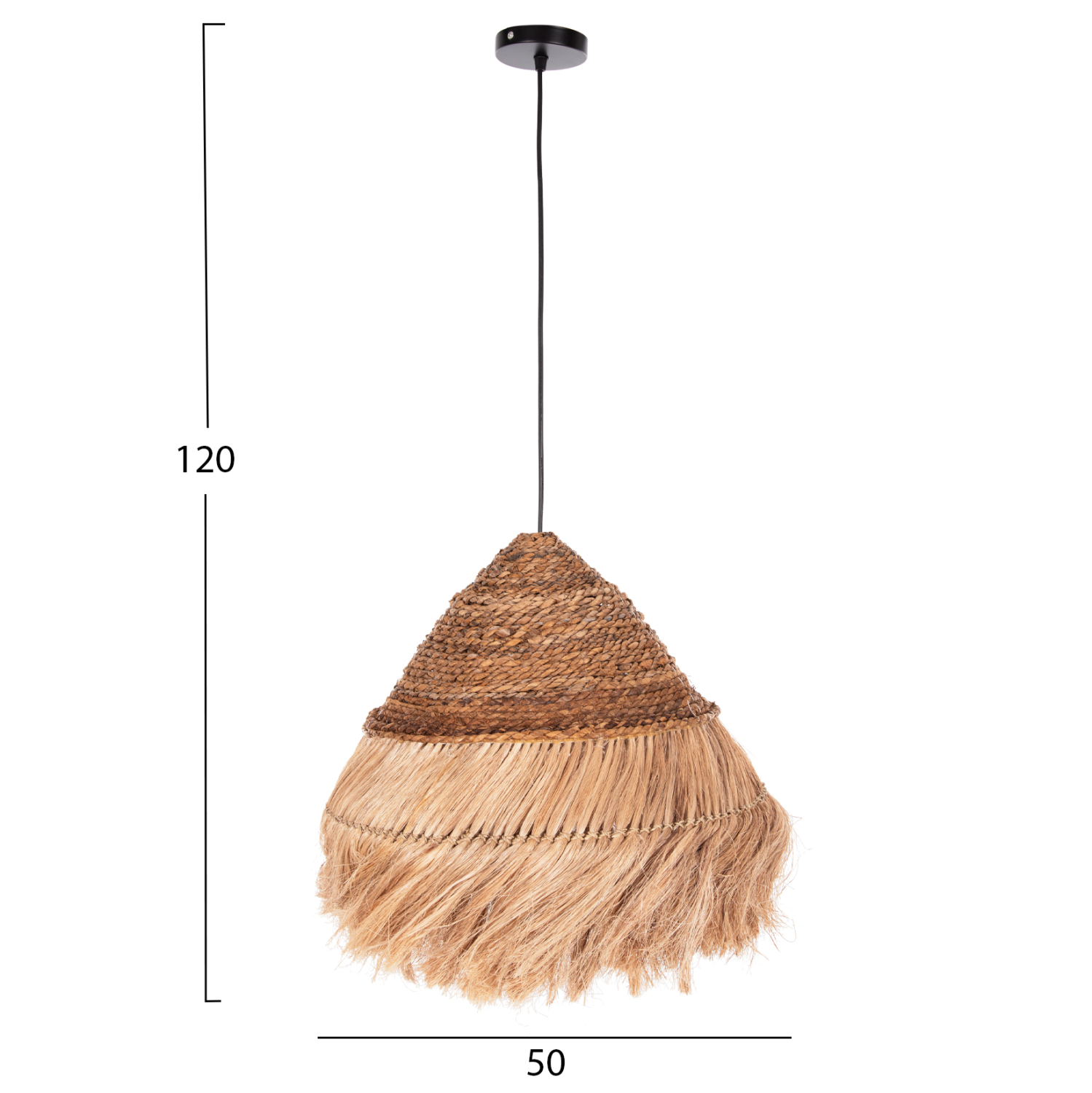 FB97762- Kρεμαστό φωτιστικό—- Αν επιθυμείτε να διακοσμήσετε το χώρο σας με ένα φωτιστικό σε boho στυλ, αυτό είναι μια χαρακτηριστική επιλογή. Είναι ένα μονόφωτο φωτιστικό με «καπέλο» σε σχήμα στρογγυλής πυραμίδας φτιαγμένο από ίνες κάνναβης Μανίλας σε φυσικό χρώμα. Το ιδιαίτερο χαρακτηριστικό αυτού του φωτιστικού είναι ότι στο επάνω μέρος του καπέλου οι ίνες είναι πλεγμένες σαν σχοινί δίνοντας μια άλλη αισθητική στο φωτιστικό.