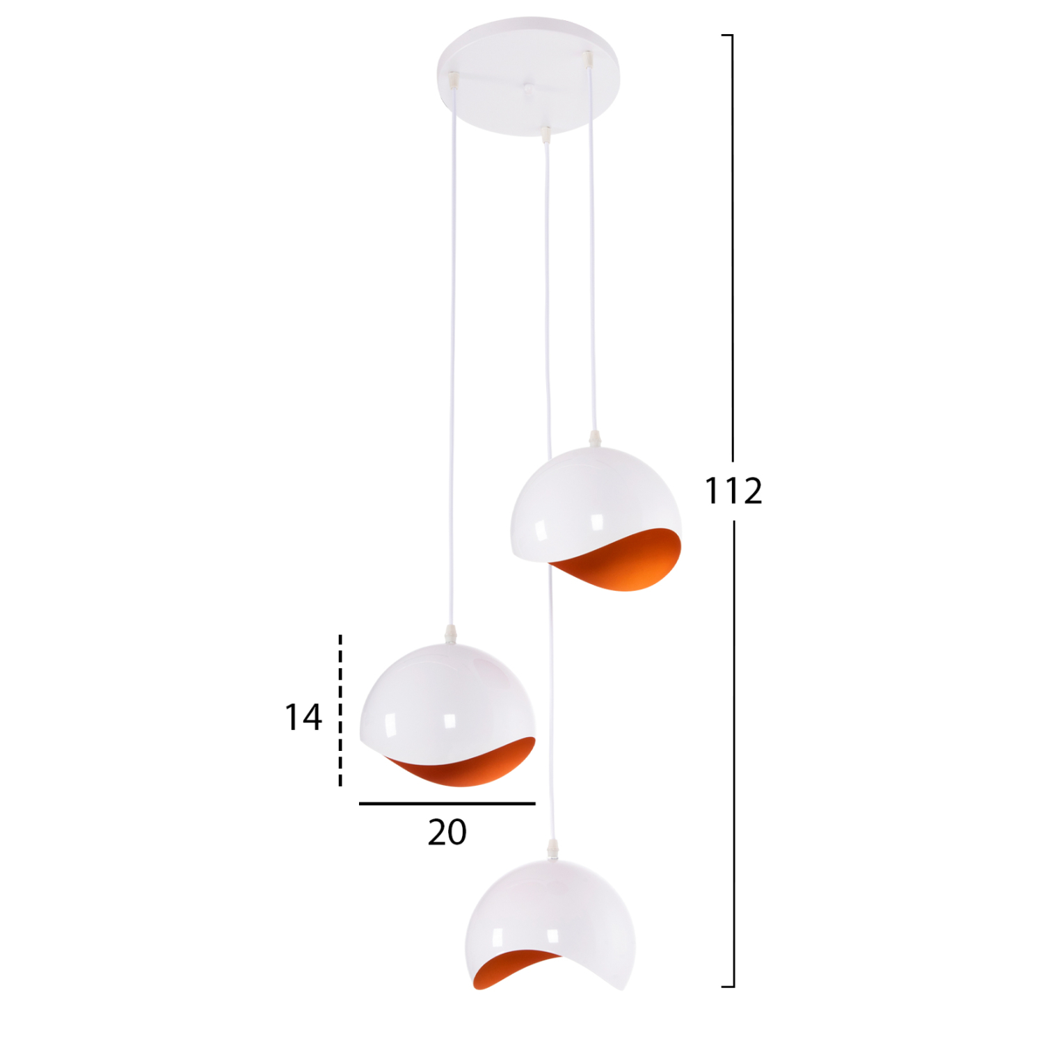 Αφήστε το φως να απλωθεί στον χώρο με ένα μοντέρνο και όμορφο κρεμαστό 3-φωτο οροφής, ολοκληρώνοντας την διακόσμησή σας. Τα συμπαγή σφαιρικά ΛΕΥΚΑ μεταλλικά καπέλα με ΠΟΡΤΟΚΑΛΙ εσωτερικό σε μοντέρνο design με καμπύλες σε διαφορετικά ύψη, θα δώσουν μια νέα εικόνα στον χώρο σας.