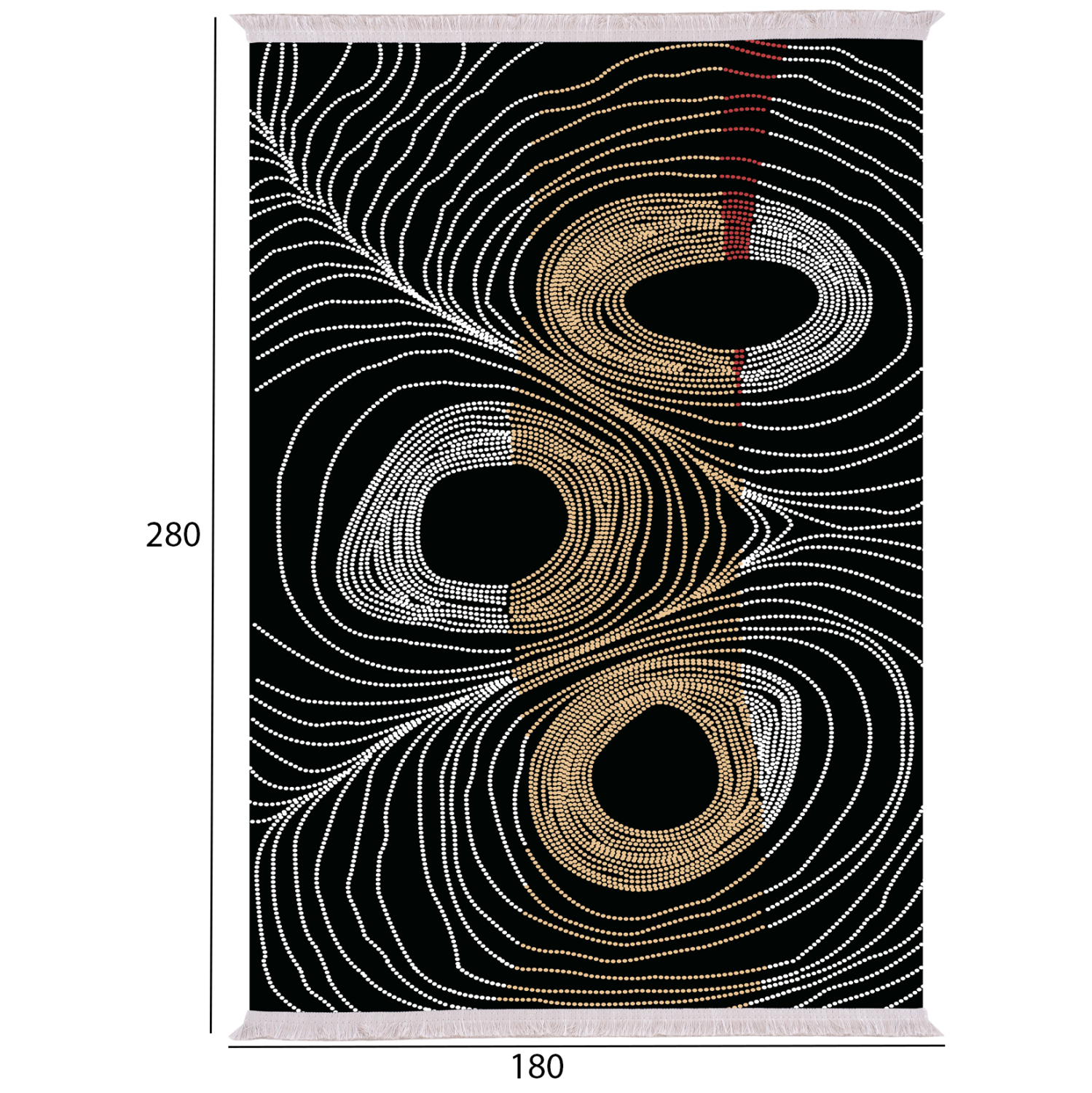 Το συγκεκριμένο χαλί με κρόσια είναι μοντέρνο από όποια οπτική κι αν το δεις. Έχει κυρίαρχα χρώματα το γκρι, και το χρυσό επάνω σε ολόμαυρο φόντο σε όλη την επιφάνεια του χαλιού. Το έντονο χαρακτηριστικό του είναι 3 ακανόνιστοι κύκλοι που μπορούν να ερμηνευθούν όπως το αντιλαμβάνεται ο καθένας. Γι’ αυτό και δίνει την αίσθηση της κίνησης στον χώρο και φυσικά θα προκαλέσει το ενδιαφέρον με την ιδιαίτερη λεπτομέρεια και την περίεργη ασυμμετρία των γραμμών του. Σίγουρα θα αναβαθμίσει αισθητικά το σαλόνι σας.