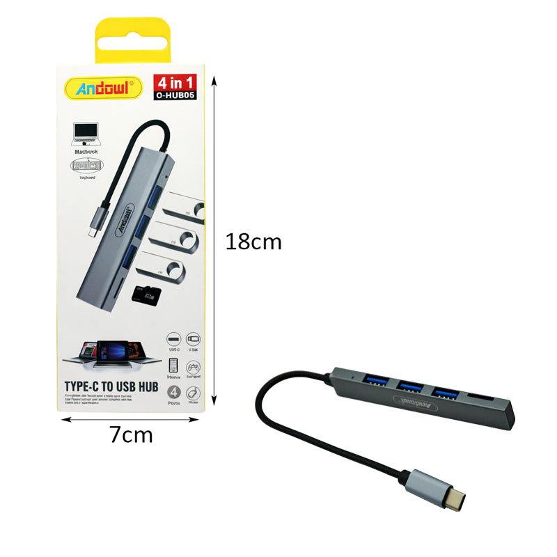 Πολυλειτουργικός αντάπτορας Hub Type-C σε USB με 4 θύρες, ιδανικός για επέκταση των δυνατοτήτων σύνδεσης του laptop ή άλλης συσκευής με θύρα Type-C. Επιτρέπει τη σύνδεση πολλαπλών συσκευών όπως ποντίκι, πληκτρολόγιο, USB flash drive, εξωτερικό σκληρό δίσκο και άλλα περιφερειακά.