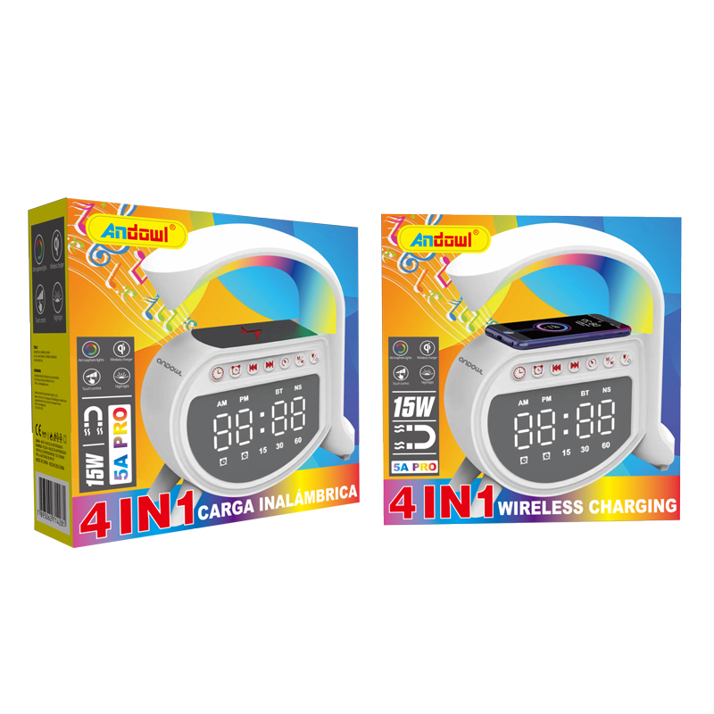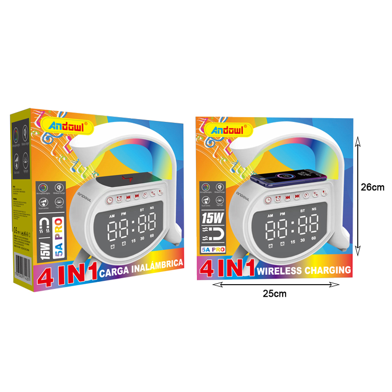 Χρόνος αναπαραγωγής: 2-3 ώρεςΠολυλειτουργικό Ηχείο Andowl 4 σε 1 με Bluetooth – Aσύρματο Φορτισή – Ξυπνητήρι & Ρολόι LED Φωτισμός 15W 5A